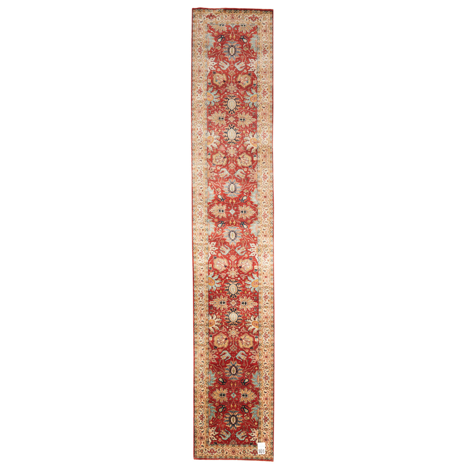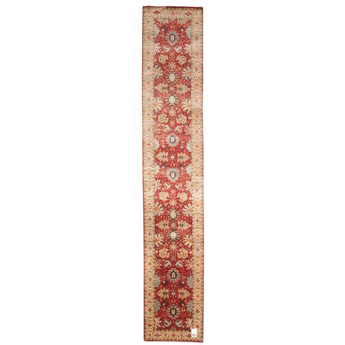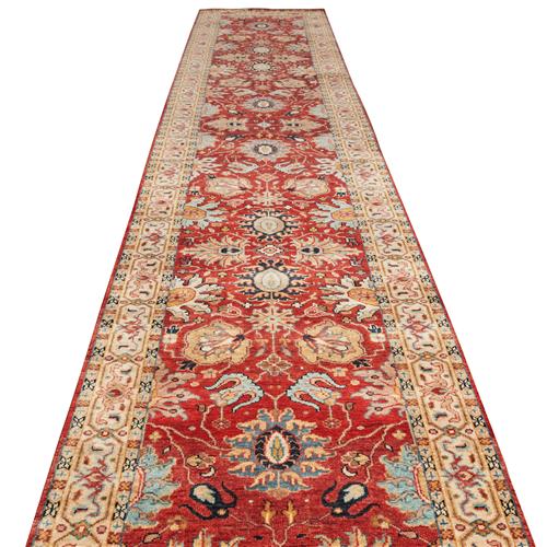 A NEW SERAPI DESIGN HALL RUNNER. VERY FINELY HAND-KNOTTED WITH THE FINEST HAND SPUN WOOL AND NATURAL DYES. ALL OVER PALMETTES AND FLORAL MOTIF DESIGN. DESIGN IN TONES OF RUST, IVORY, LIGHT BLUE, AND INDIGO BLUE. SIZE: 428 X 78 CM RRP $3,200 ORIGIN: AGRA TAJ MAHAL PROVINCE DOCUMENTATION OF AUTHENTICITY INCLUDED.