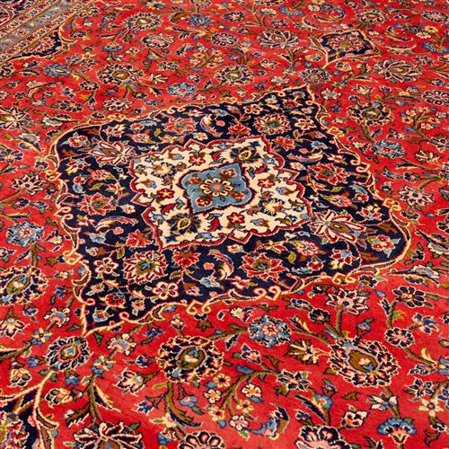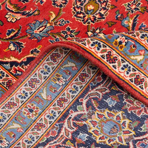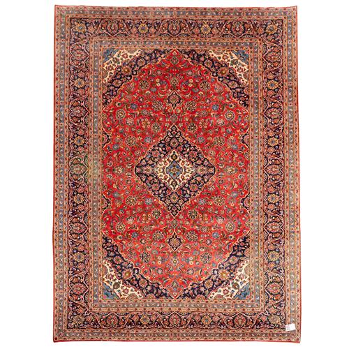 AN ORIGINAL CLASSIC PERSIAN KASHAN CARPET, 100% HAND KNOTTED SOLID LAMBS WOOL. SOLID DENSE PILE. CLASSIC KASHAN DESIGN OF ELONGATED FLORAL MEDALLION IN PERSIAN BLUE, CREAM AND FRENCH BLUE ON A SOFT RED FIELD OF SHAH ABBASI PALMETTES, FLORAL MOTIFS; TENDRILS. BORDER IN PERSIAN BLUE OF PALMETTES, FLORAL SPRAYS AND TENDRILS. SIZE: 396 X 294 CM - RRP: $4,500- ORIGIN: IRAN DOCUMENTATION OF AUTHENTICITY INCLUDED.