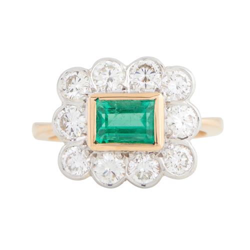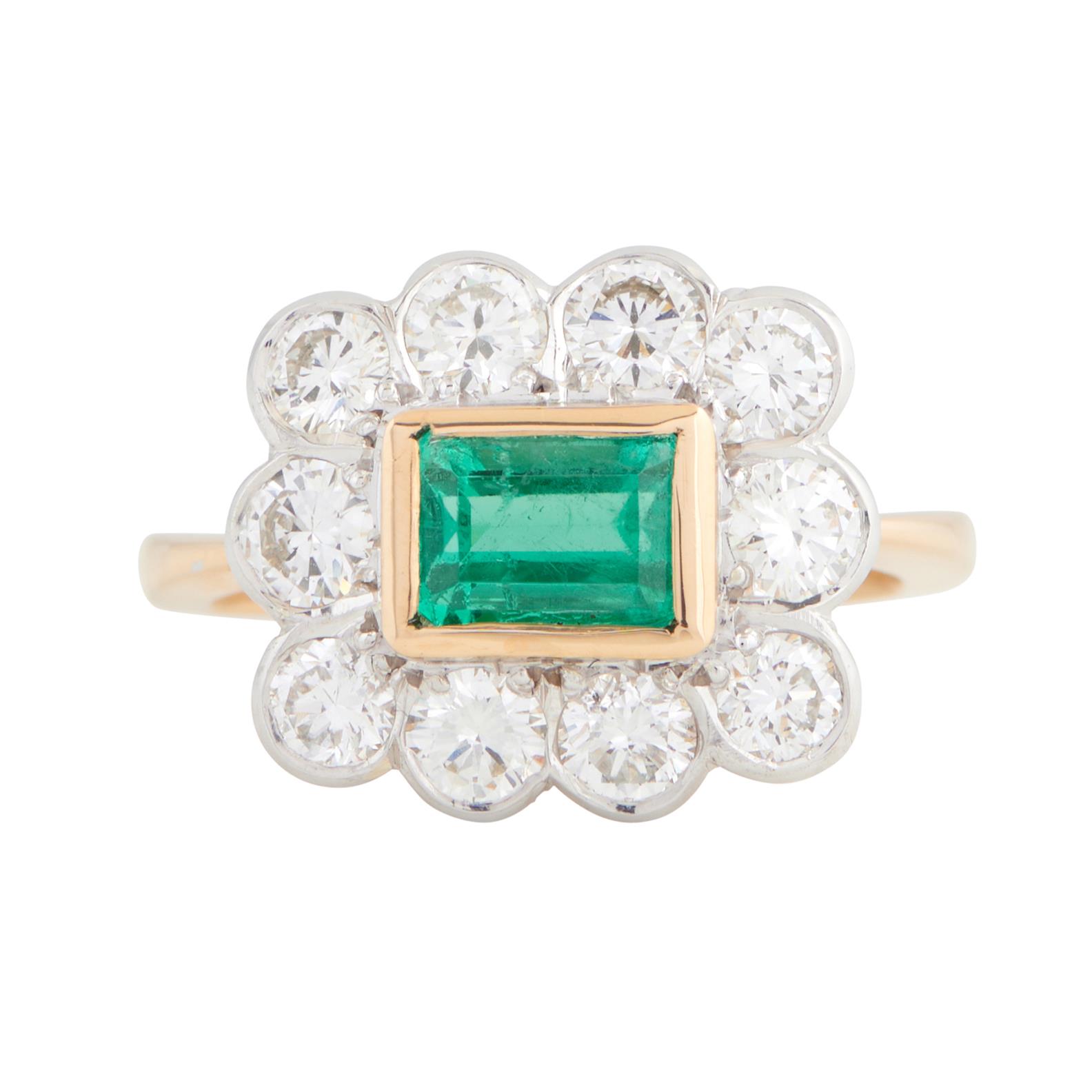 Of cluster design, centring an emerald-cut emerald weighing approximately 0.90 carats, within a surround of ten collet-set brilliant-cut diamonds together weighing approximately 1.35 carats, size L 1/2.
