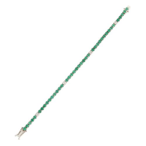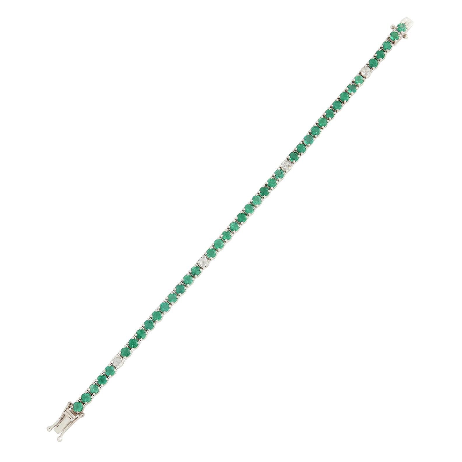Modelled as a continuous line of claw-set circular-cut emeralds, spaced at intervals with claw-set rose-cut diamonds, the emeralds together weighing approximately 6.00 carats, the diamonds together weighing approximately 0.64 carats, completed by a tongue and groove clasp, length 180mm.
