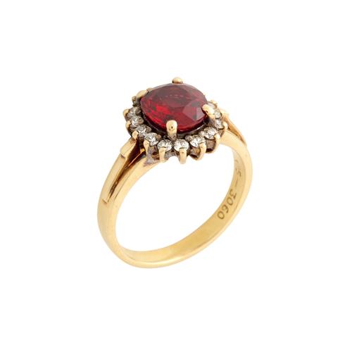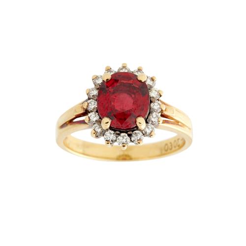 Of cluster design, centring a claw-set oval-cut Beryllium treated ruby weighing approximately 1.68 carats, within a surround of brilliant-cut diamonds together weighing approximately 0.32 carats, size M.