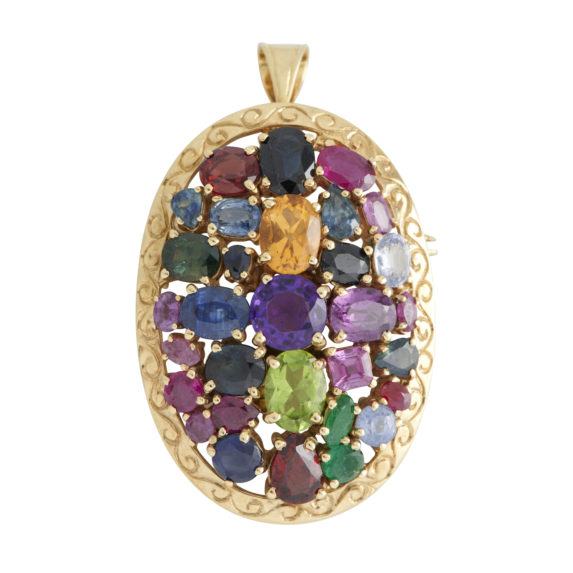 Modelled as an oval panel, claw-set throughout with mixed-cut multi-coloured gems including peridot, amethyst, sapphire, emerald, garnet, citrine and ruby, length 42mm, width 30mm, gross weight 20.4 grams.