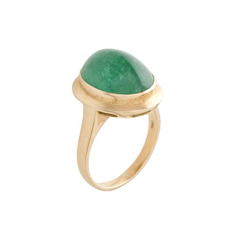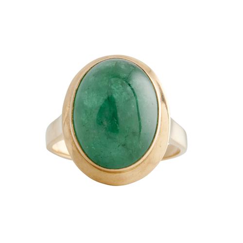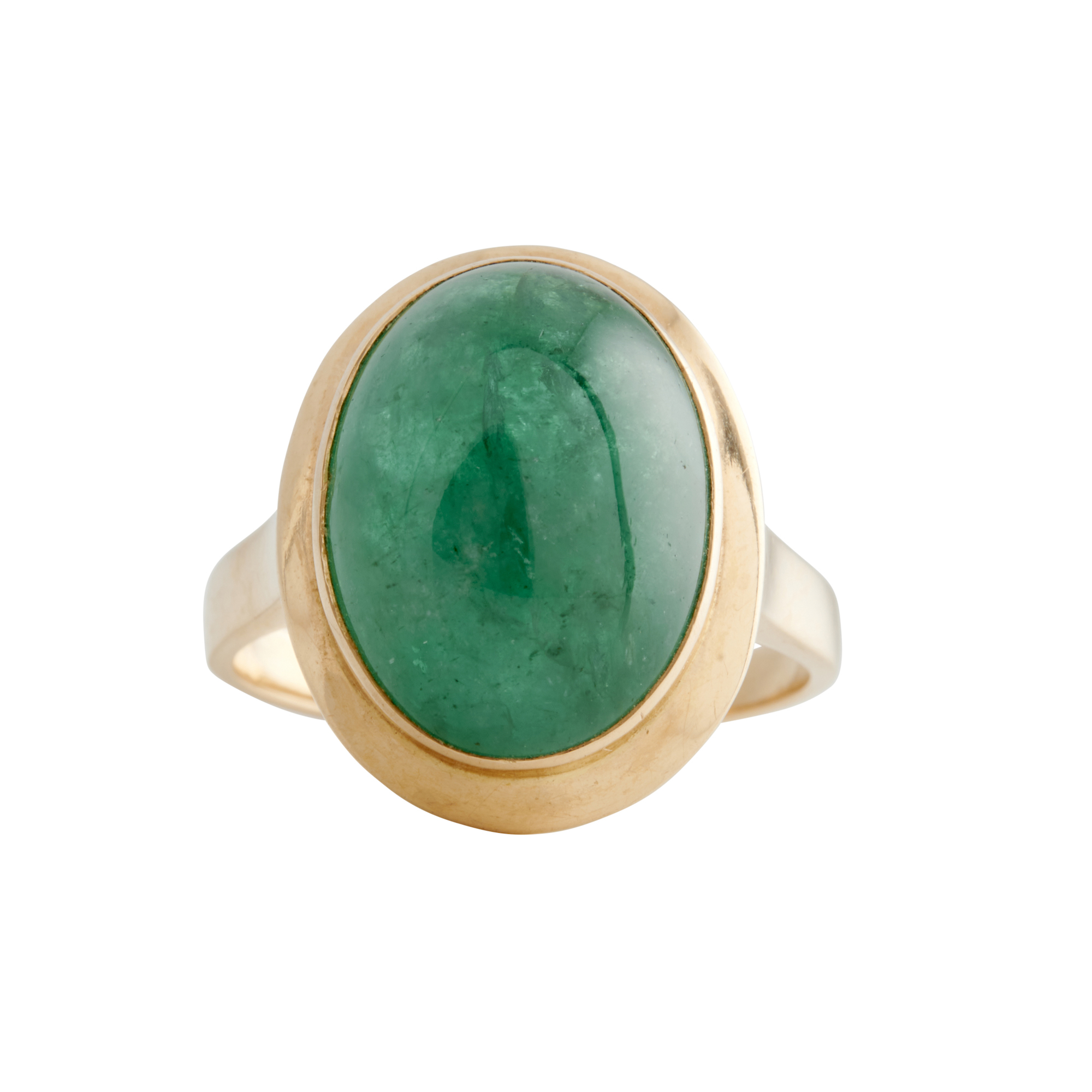 Bezel-set with an oval emerald cut en cabochon weighing approximately 8.00 carats, size N.