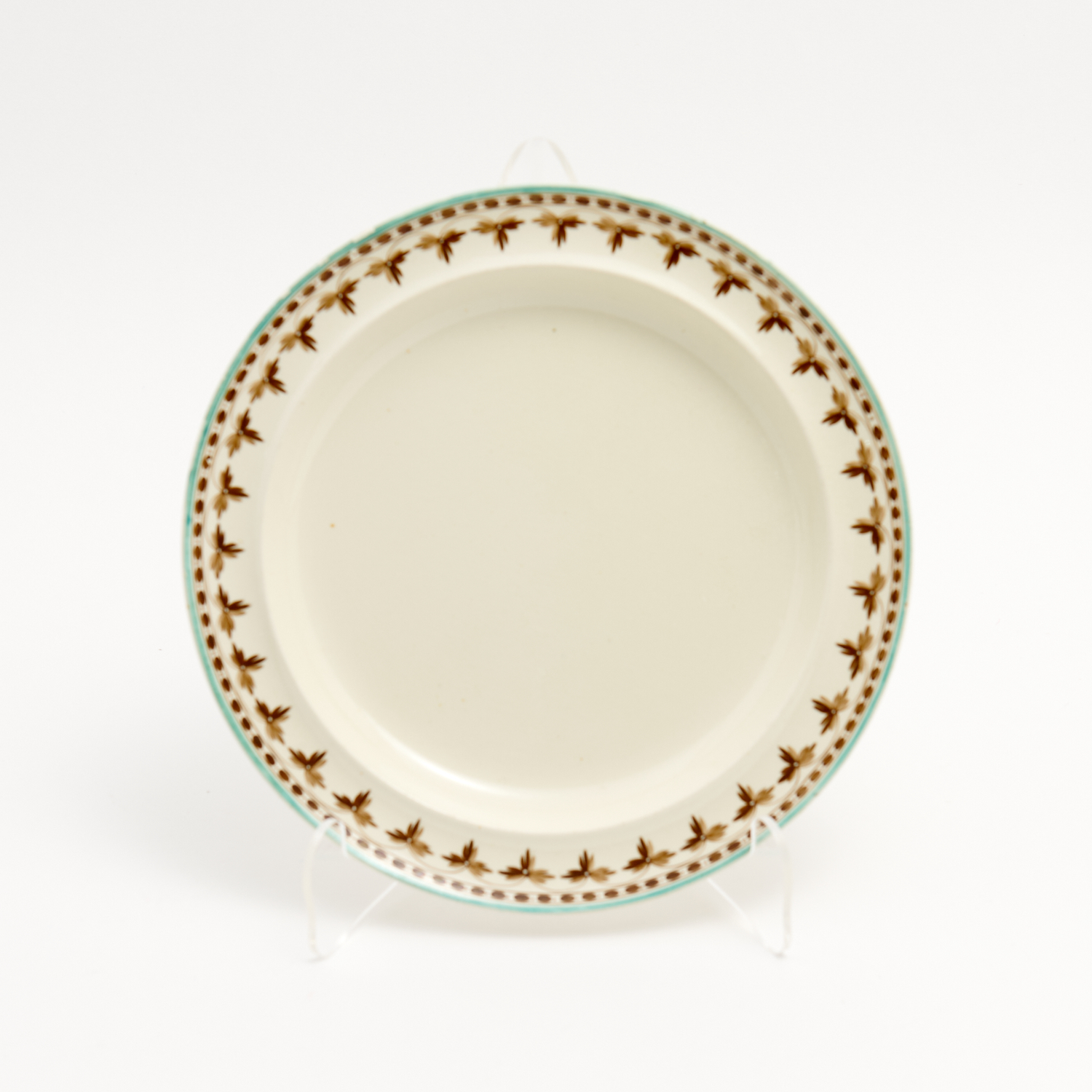 AN 18TH CENTURY WEDGWOOD CREAMWARE PLATE WITH BROWN NECKLACE DESIGN AND MINT GREEN LIP DIA.20CM, LEONARD JOEL DELIVERY SIZE: SMALL