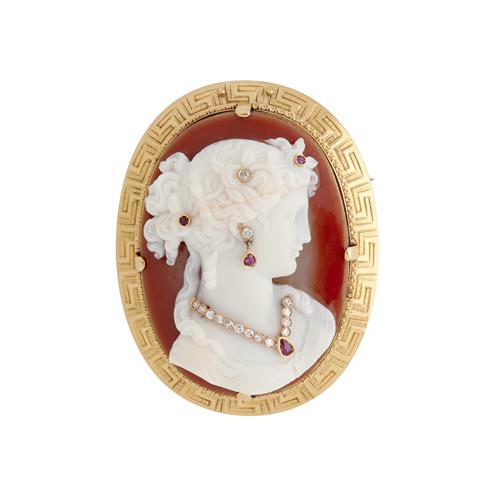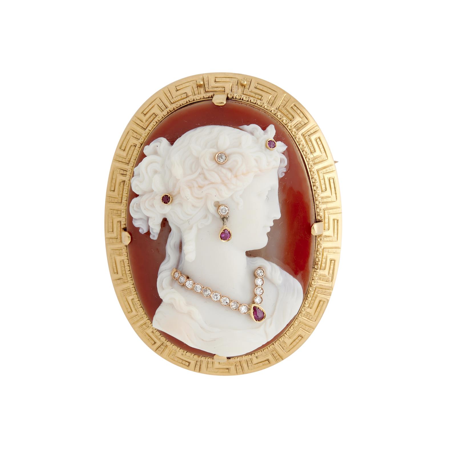 Centring a shell cameo of a woman in profile wearing jewellery detailed with circular-cut rubies and brilliant-cut diamonds, within a greek-key pattern border, length 60mm, width 42mm, gross weight 39.7 grams.