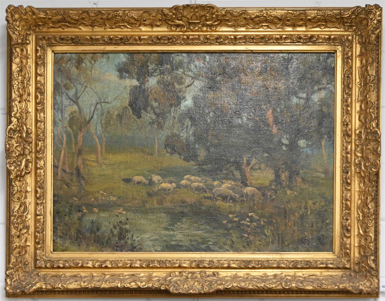 FREDERICK GEORGE REYNOLDS, LANDSCAPE SCENE WITH SHEEP, OIL ON CANVAS, SIGNED LOWER RIGHT, 43.5 X 59CM, FRAME SIZE: 64 X 79CM