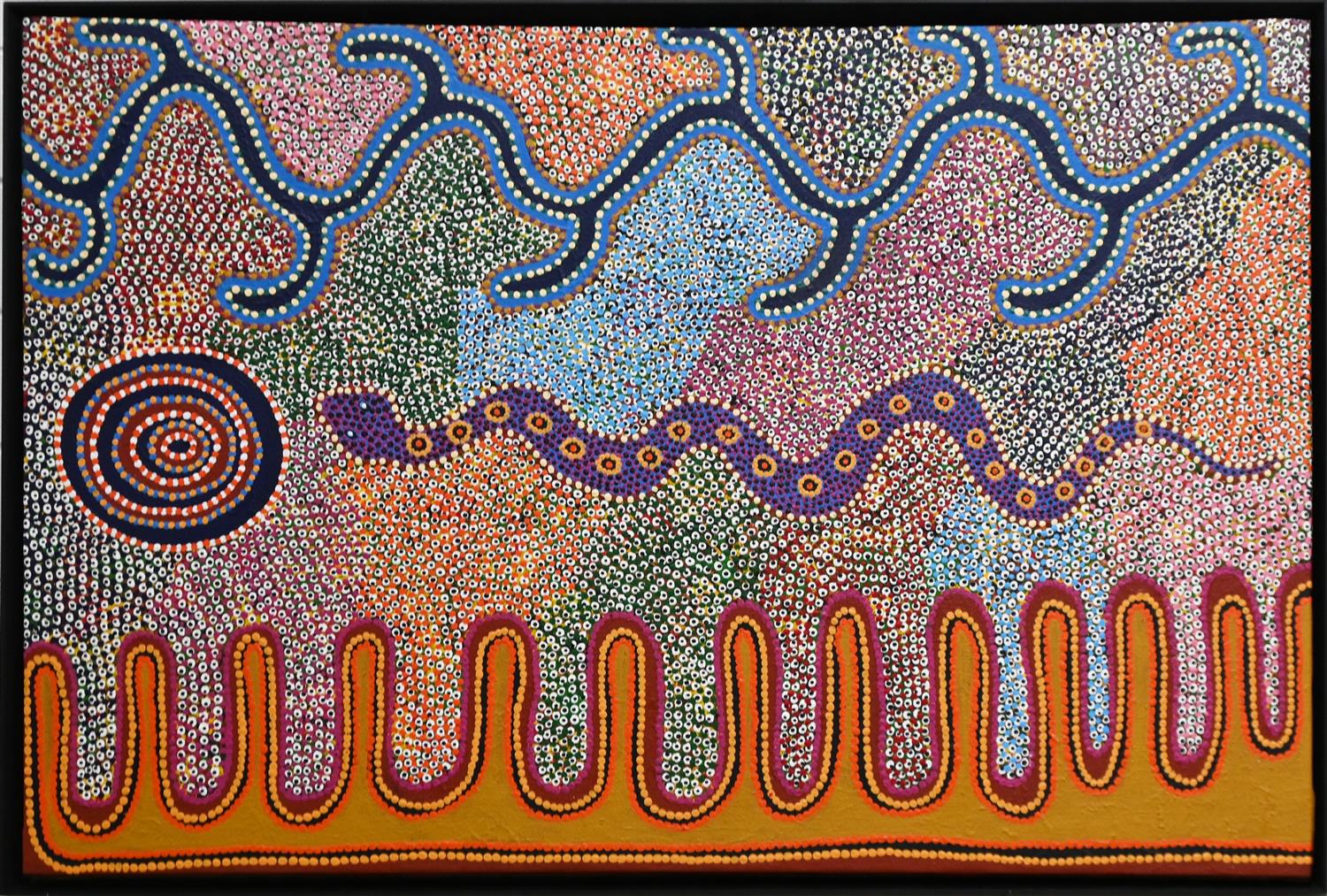 PATRICIA LEE NAPANGARTI, YARUMAN, SYNTHETIC POLYMER PAINT ON LINEN, 79 X 119CM, FRAME SIZE: 83 X 122CM