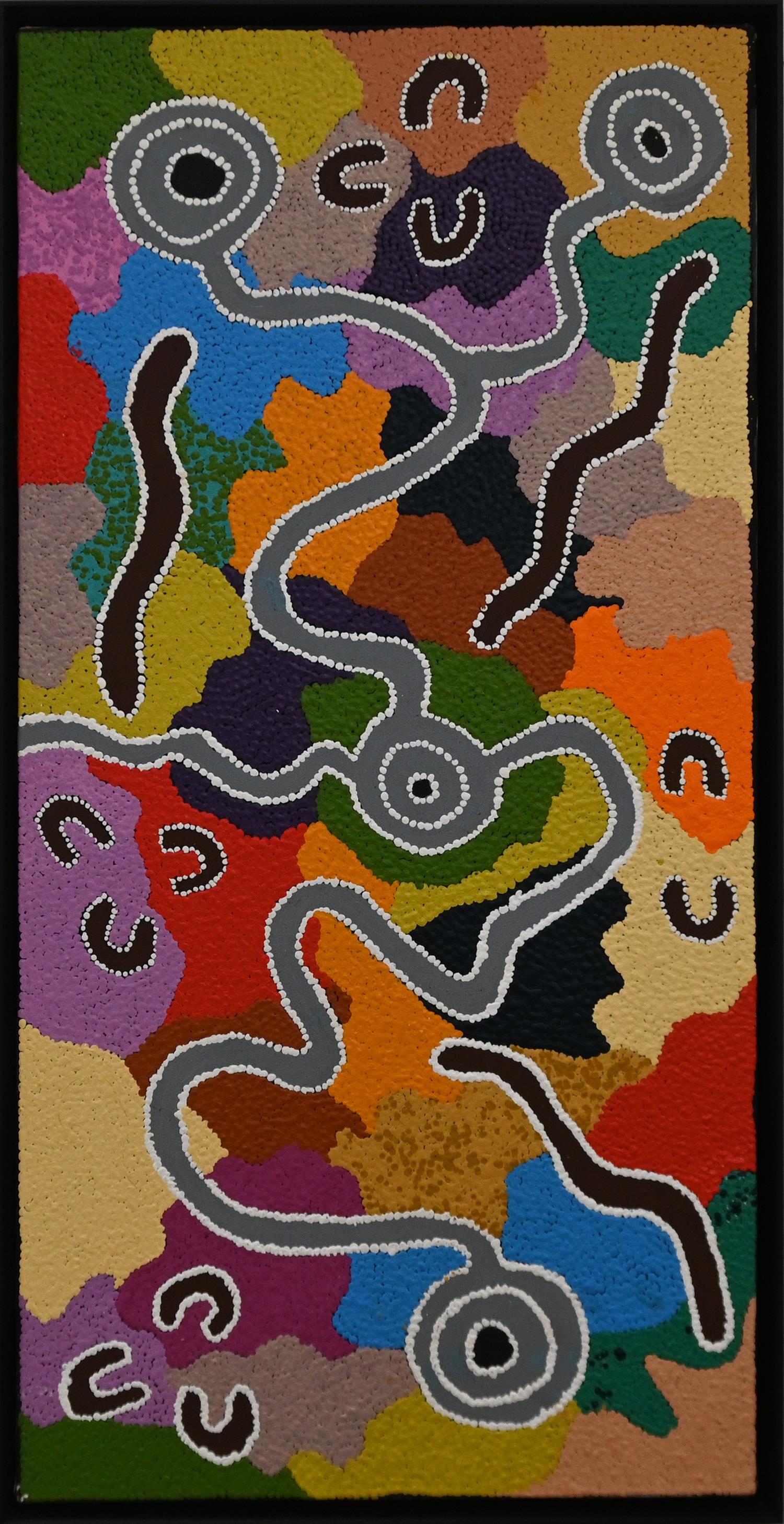 AGNES GIMME NUNGURRAYI, FATHER'S COUNTRY, SYNTHETIC POLYMER PAINT ON CANVAS, 100 X 50CM, FRAME SIZE: 103 X 53CM