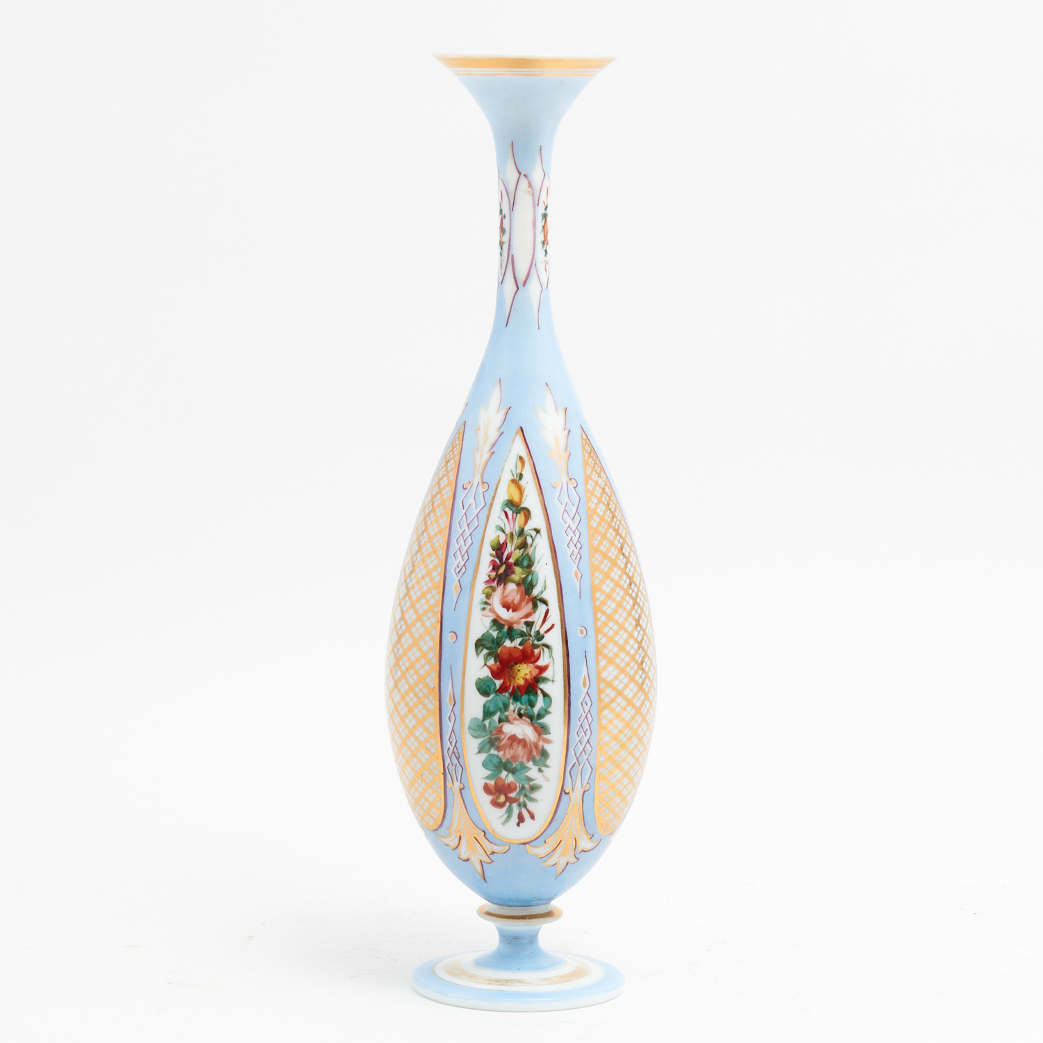 A MID-VICTORIAN HAND-PAINTED AND GILT MILK GLASS VASE H.36.5CM, LEONARD JOEL DELIVERY SIZE: MEDIUM
