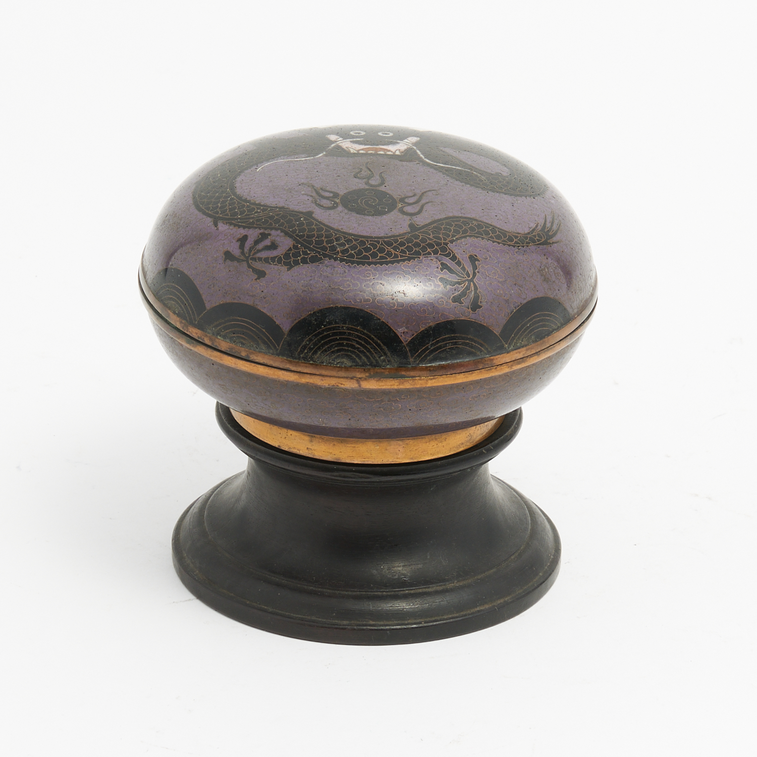 AN EARLY 20TH CENTURY CHINESE CLOISONNE DRAGON-DECORATED LIDDED CONTAINER ON ORIGINAL EBOINISED WOODEN BASE DIA.12CM, LEONARD JOEL DELIVERY SIZE: SMALL