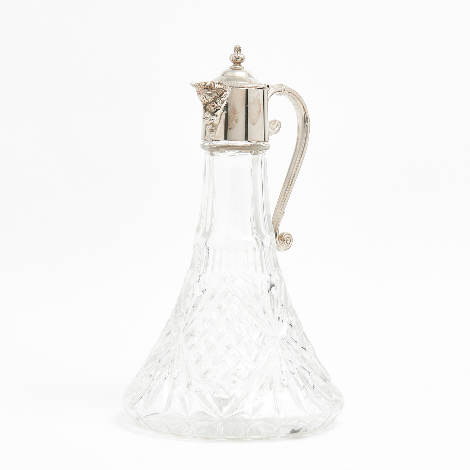 A VICTORIAN SILVER PLATE AND GLASS CLARET JUG WITH MASK HEAD SPOUT H.29CM, LEONARD JOEL DELIVERY SIZE: MEDIUM