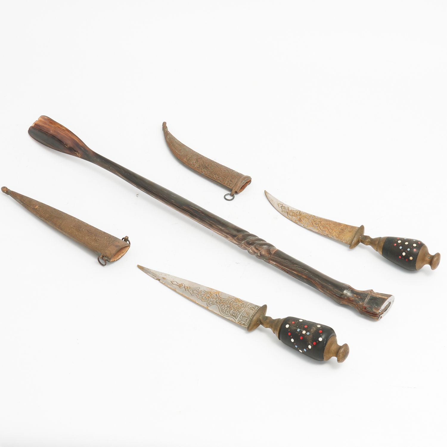 TWO EARLY 20TH CENTURY HORN HANDLE ORNAMENTAL BRASS DAGGERS AND MATCHED SOLID HORN HORSE'S HOOF SHOEHORN L.57.5CM (LONGEST), LEONARD JOEL DELIVERY SIZE: MEDIUM