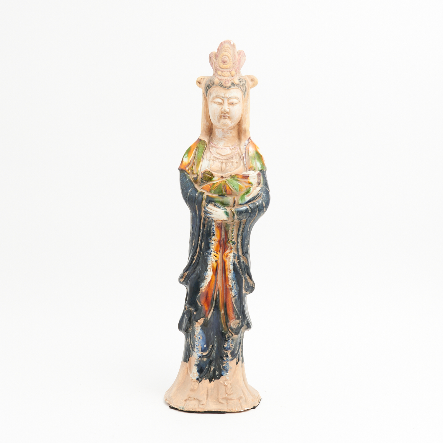 A LATE 19TH CENTURY CHINESE GLAZED TERRACOTTA FUNEREAL BURIAL FIGURE OF GUAN YIN HOLDING A BABY H.48CM, LEONARD JOEL DELIVERY SIZE: MEDIUM