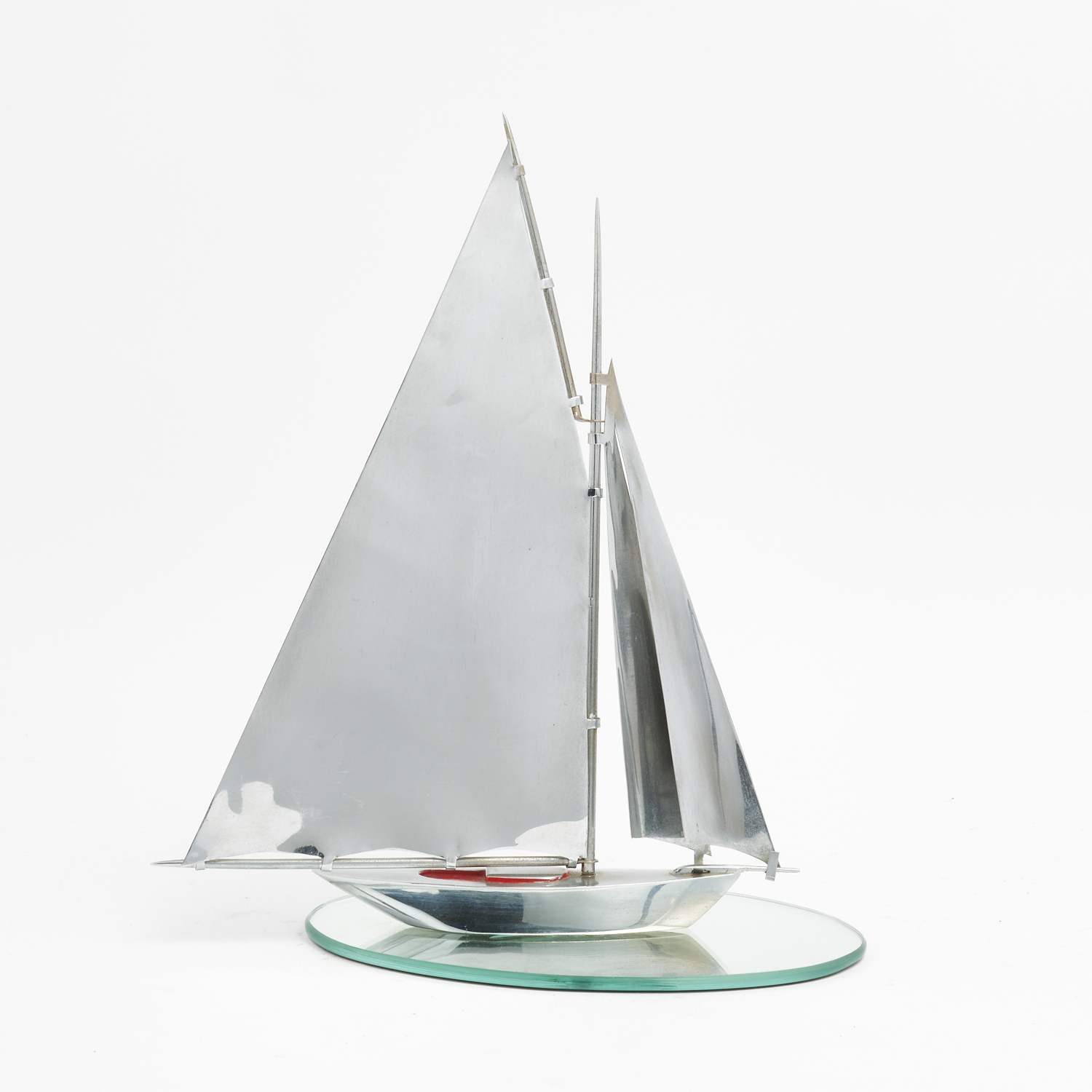 A 1940S CHROMED BRASS SAILING YACHT ON MIRROR BASE H.37.5CM, LEONARD JOEL DELIVERY SIZE: MEDIUM