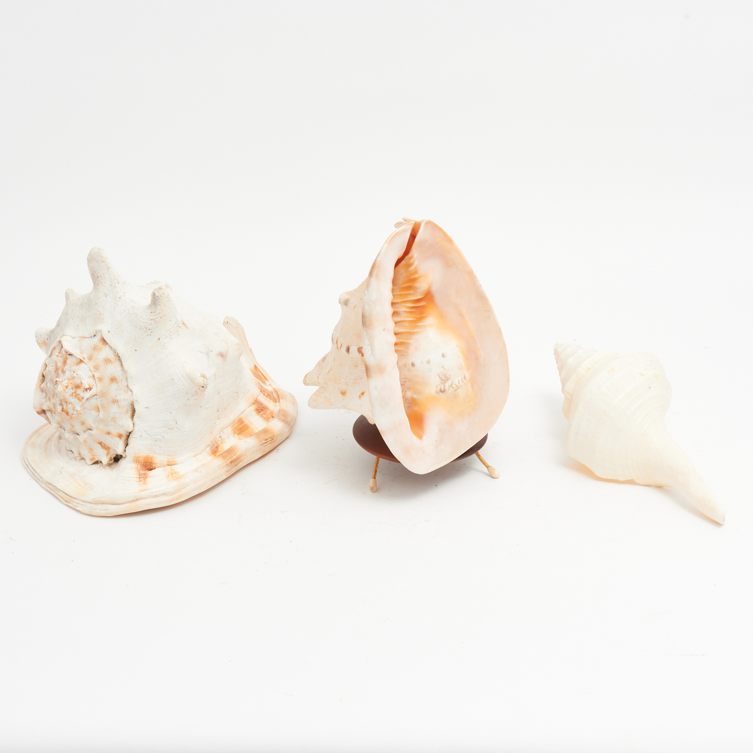 A GROUP OF THREE LARGE AUSTRALIAN NORTHERN QUEENSLAND BEACH FOUND SHELLS INCLUDING ONE MOUNTED ON WOODEN AND BRASS BASE L.23CM (TALLEST), LEONARD JOEL DELIVERY SIZE: MEDIUM