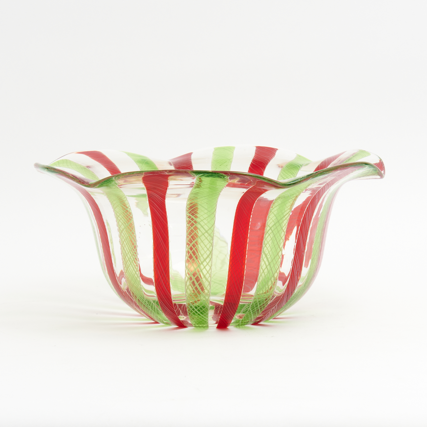 A LARGE MID-CENTURY ITALIAN LATTICINO MURANO GREEN AND RED ALTERNATING CLEAR GLASS BOWL DIA.30CM, LEONARD JOEL DELIVERY SIZE: MEDIUM
