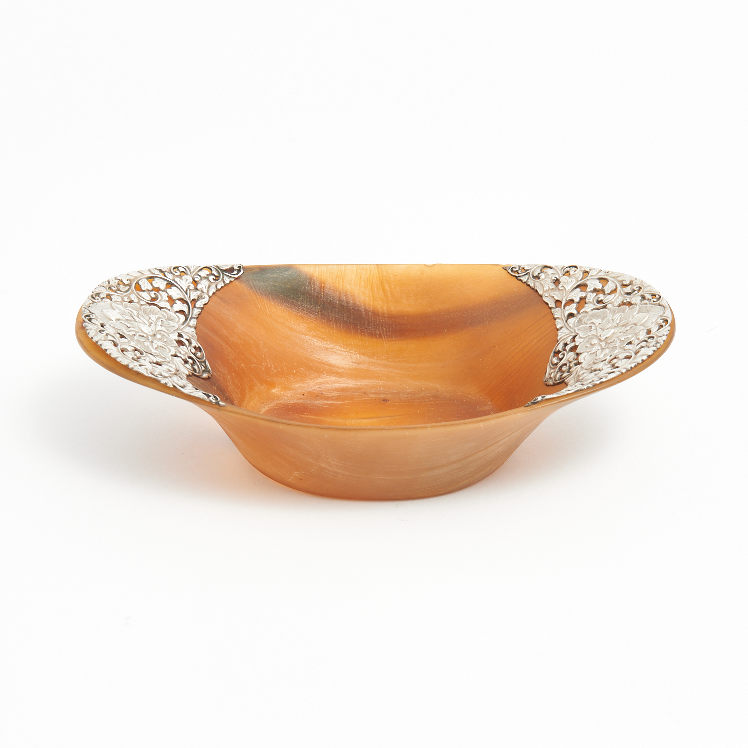 A 19TH CENTURY SCOTTISH HORN AND STERLING SILVER ADORNED SERVING BOWL L.22CM (A/F), LEONARD JOEL DELIVERY SIZE: SMALL