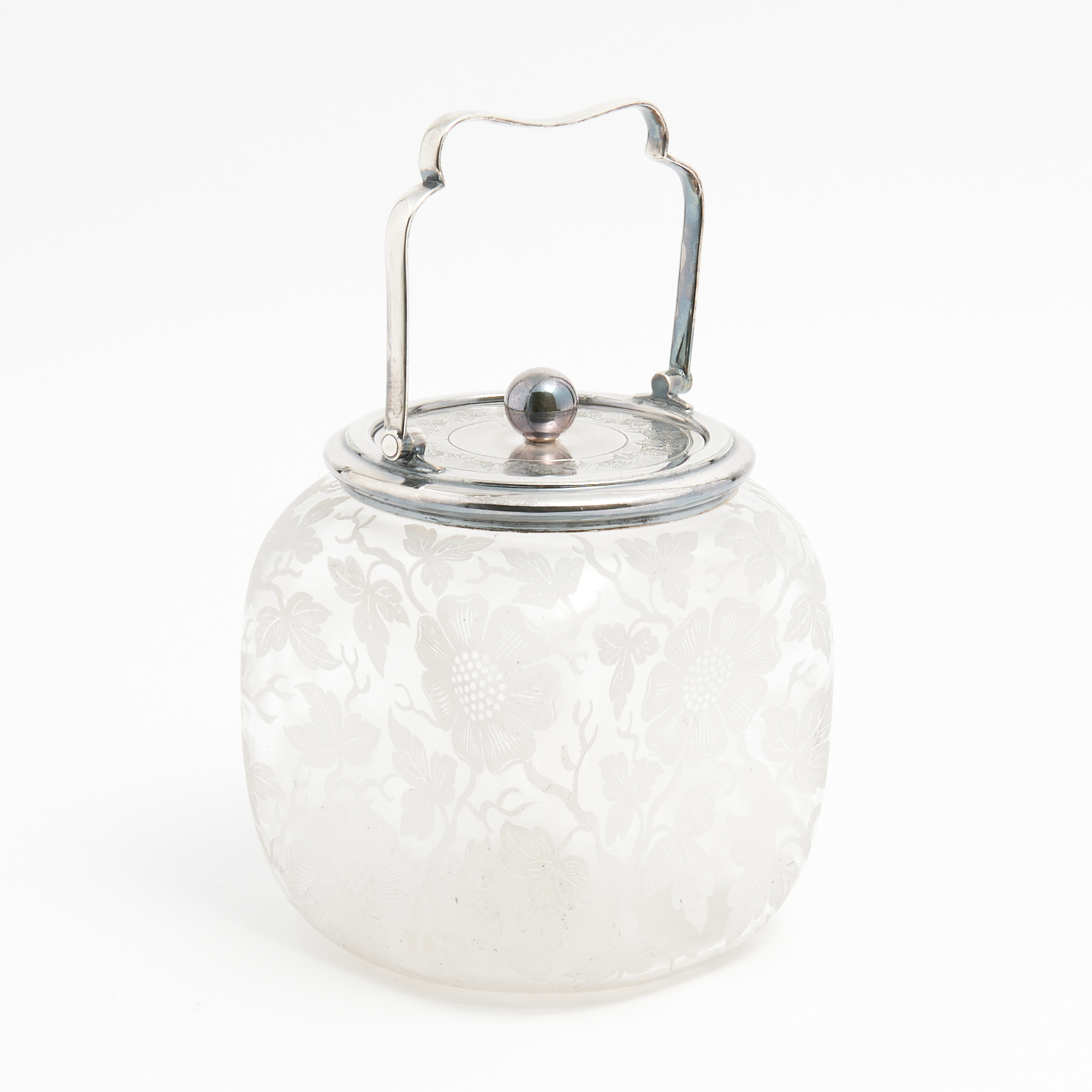 A 19TH CENTURY ENGLISH STEPHANS AND WILLIAMS ETCHED FLORAL GLASS AND SILVER PLATE LOLLY / BISCUIT BARREL H.14CM, LEONARD JOEL DELIVERY SIZE: MEDIUM