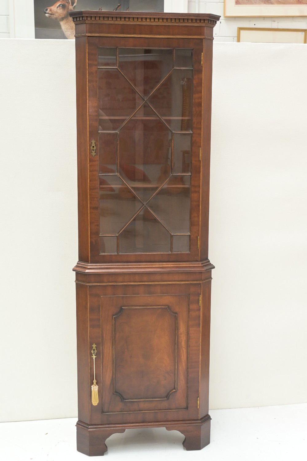 AN EARLY 20TH CENTURY MAHOGANY ASTRGAL GLAZED CORNER DISPLAY CABINET (182H X 62W X 42D CM) (LEONARD JOEL DELIVERY SIZE: X-LARGE)