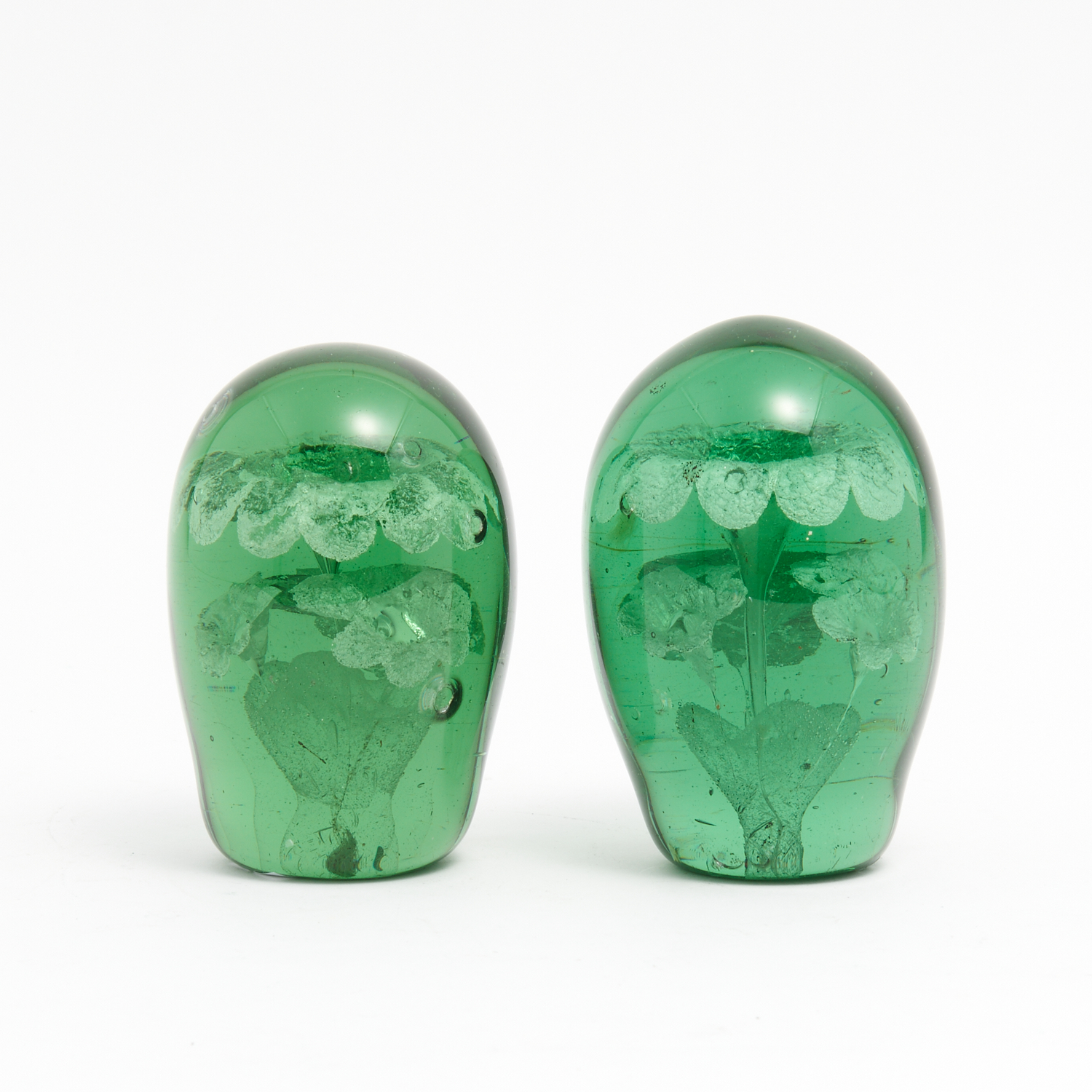 A PAIR OF DARK GREEN FLORAL DUMPS WITH A CENTRAL DAISY ABOVE SIX SMALL FLOWERS H.11CM
