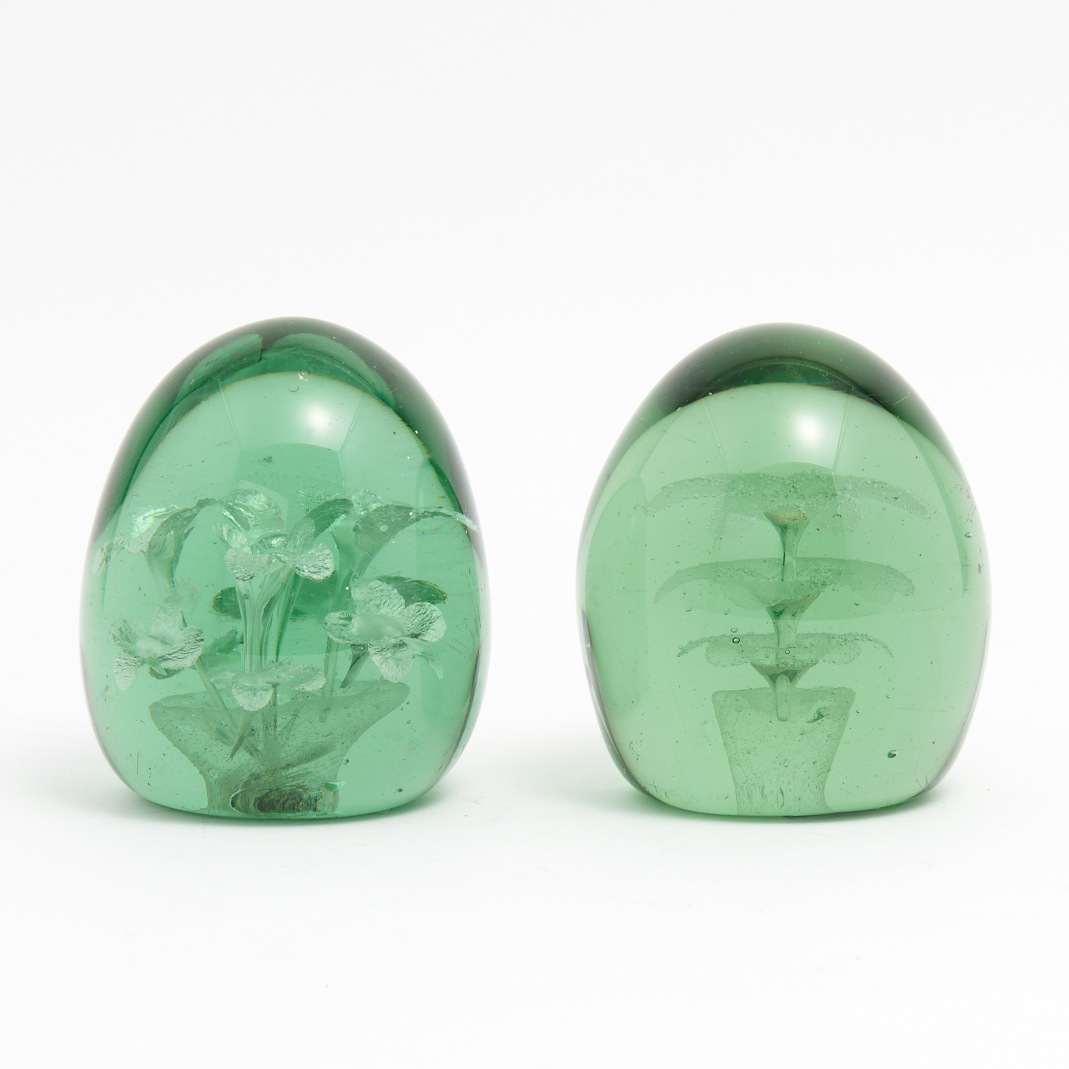 TWO VERY GOOD VICTORIAN BOTTLE GLASS FLORAL DUMPS, ONE WITH TEN SILVER FOIL FLOWERS AND THE OTHER WITH A STACK OF THREE CHALK BUBBLE FLOWERS H.10.5CM, LEONARD JOEL DELIVERY SIZE: MEDIUM
