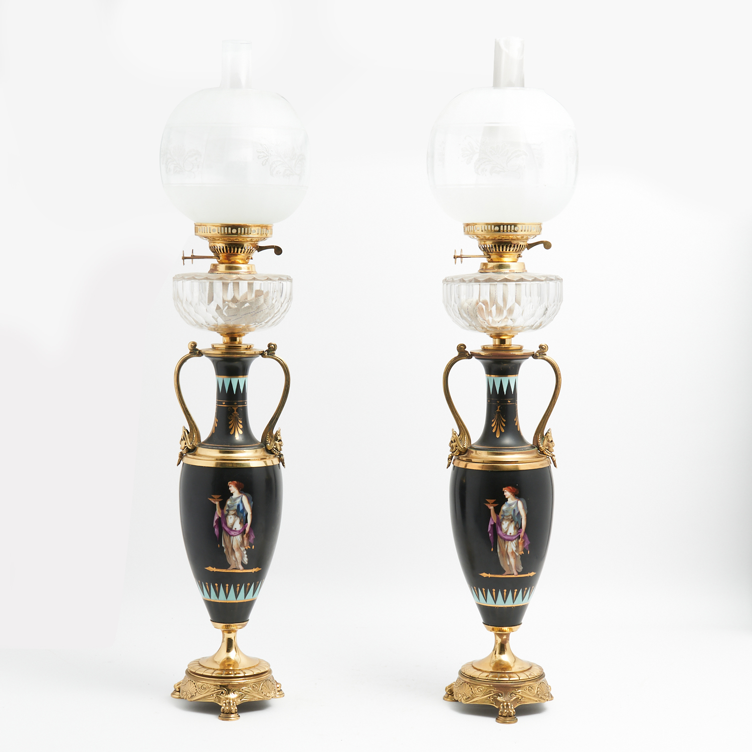 A FINE PAIR OF VICTORIAN KEROSENE LAMPS WITH BRASS MOUNTED PORCELAIN BASES AND CRYSTAL BOWLS, BURNERS MARKED 'JOHN SCOTT', H.90CM (A/F, ONE CRYSTAL BOWL CRACKED), LEONARD JOEL DELIVERY SIZE: X-LARGE