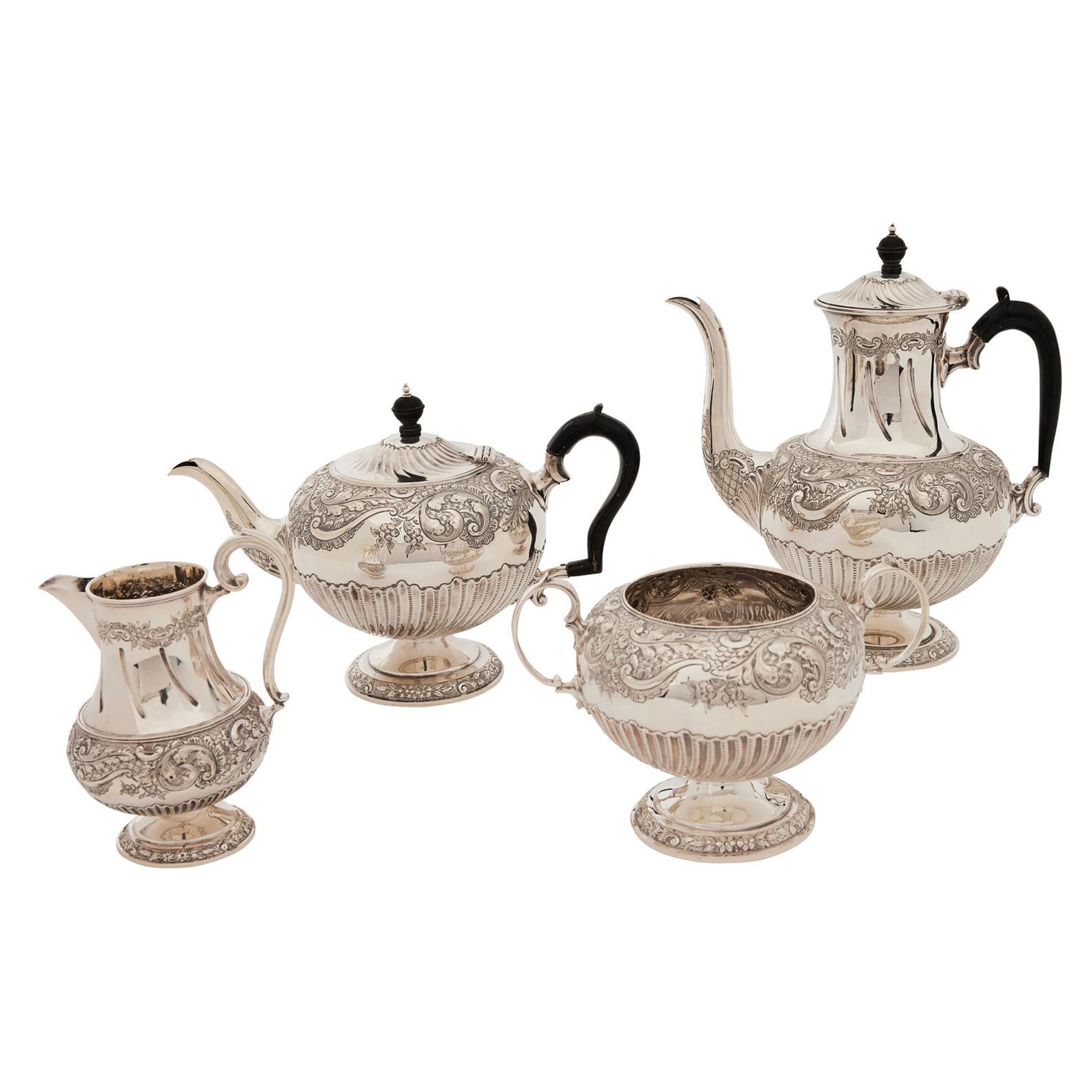 Maker's mark Mappin & Webb, Sheffield 1892, comprising teapot, coffee pot, cream jug and sugar basin, each with a half gadrooned ovoid body decorated with rocaille scrolls and scales, the teapot and coffee pot each with an ebonised handle.