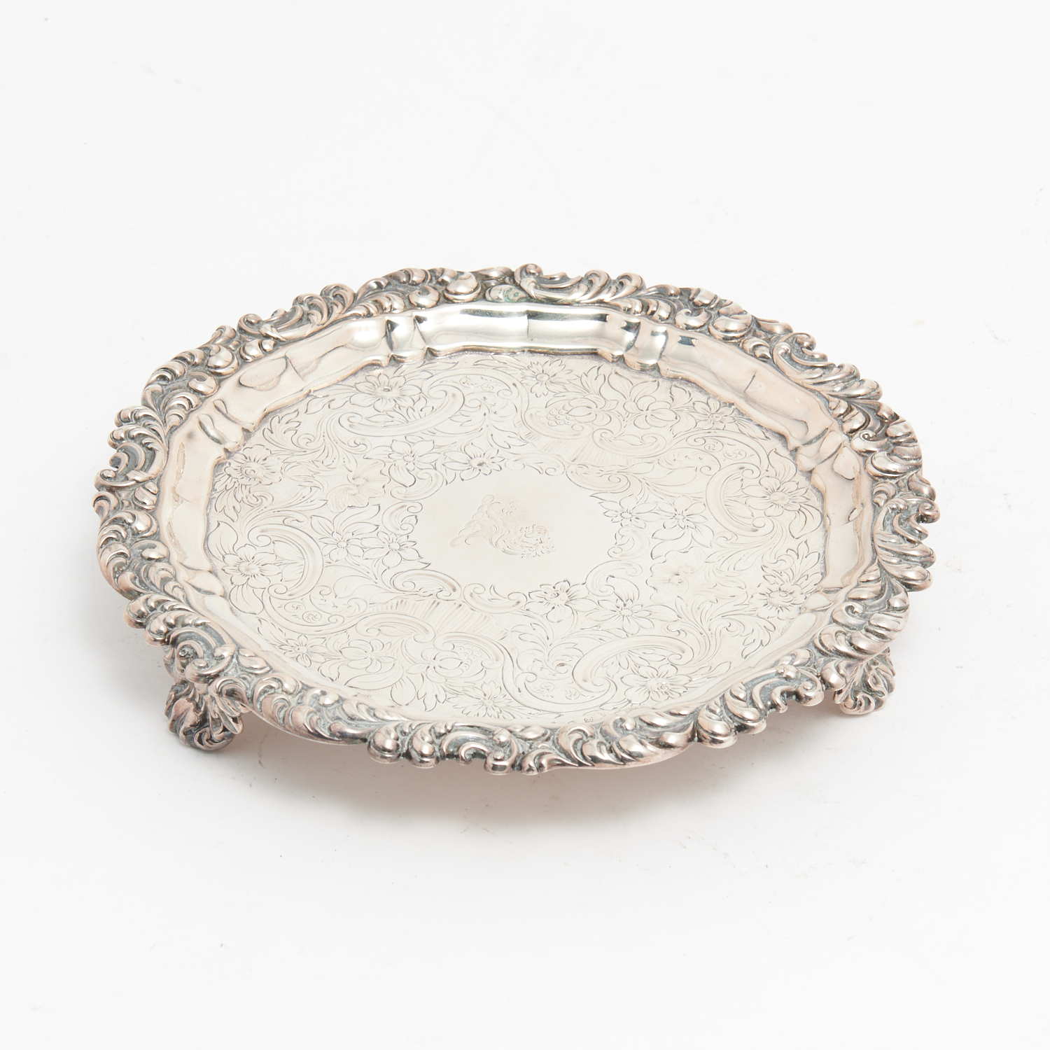 A POSSIBLY WILLIAM IV STERLING SILVER SALVER WITH HEAVY CHASED DECORATION AND SCROLL/ACANTHUS LEAF BORDER 366G DIA.20.5CM, LEONARD JOEL DELIVERY SIZE: SMALL