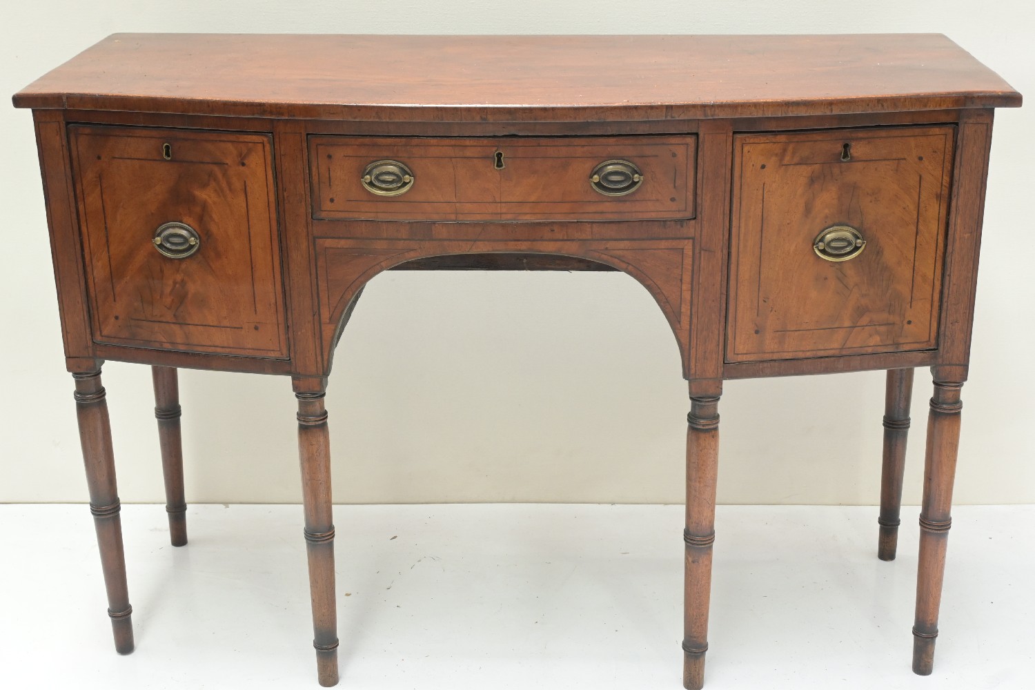A GEORGE III MAHOGANY AND INLAID BOWFRONT SIDEBOARD (A/F) (91H X 137W X 58D CM) (PLEASE NOTE THIS HEAVY ITEM MUST BE REMOVED BY CARRIERS AT THE CUSTOMER'S EXPENSE. LEONARD JOEL STAFF CANNOT ASSIST CARRYING THIS ITEM) (X-LARGE)