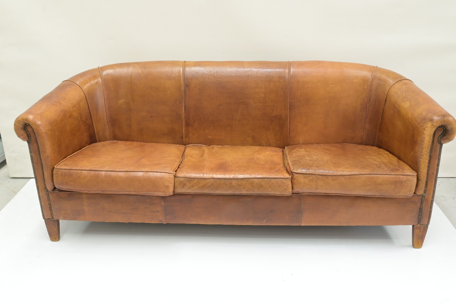 A VINTAGE LEATHER EUROPEAN TUB SOFA (A/F) (77H X 197W X 73D CM) (PLEASE NOTE THIS HEAVY ITEM MUST BE REMOVED BY CARRIERS AT THE CUSTOMER'S EXPENSE. LEONARD JOEL STAFF CANNOT ASSIST CARRYING THIS ITEM) (X-LARGE)
