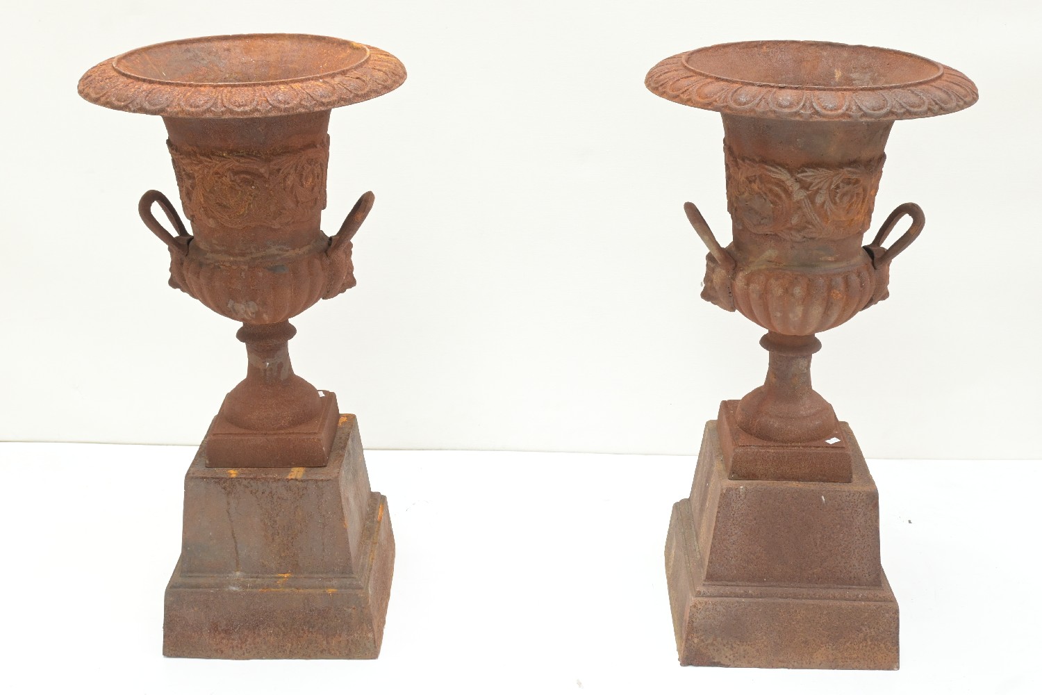 A PAIR OF CAST IRON URNS ON BASES (92H X 50DIA CM) (PLEASE NOTE THIS HEAVY ITEM MUST BE REMOVED BY CARRIERS AT THE CUSTOMER'S EXPENSE. LEONARD JOEL STAFF CANNOT ASSIST CARRYING THIS ITEM) (X-LARGE)