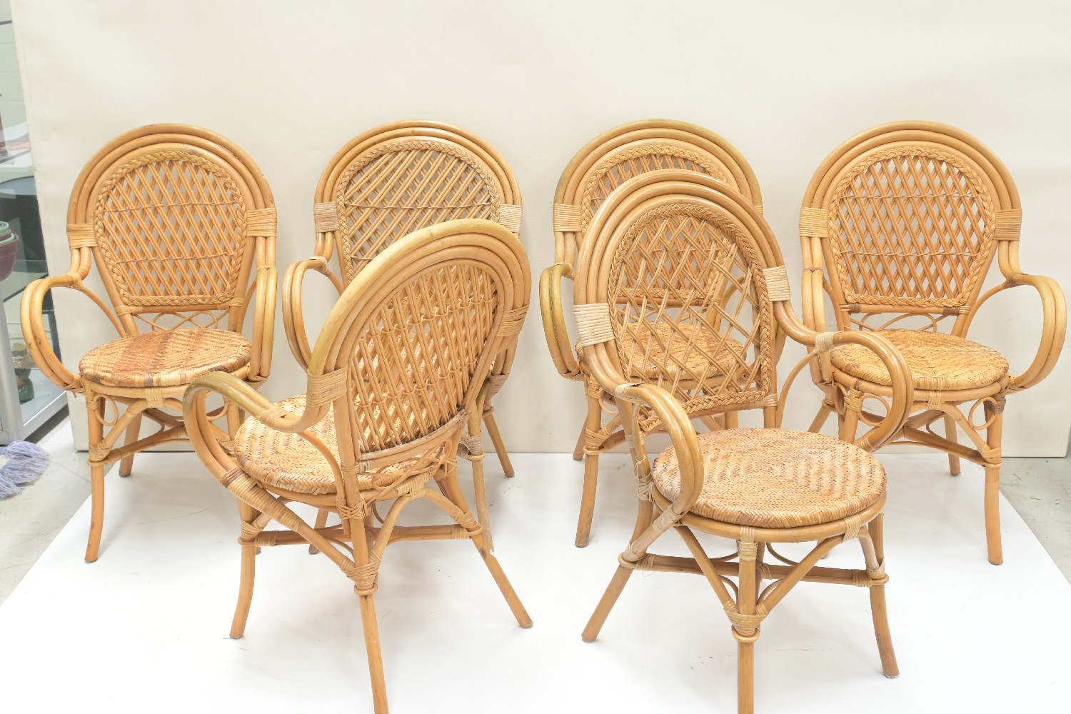 A SET OF SIX MID CENTURY WICKER ARM CHAIRS (A/F) (96H X 60W X 55D CM) (LEONARD JOEL DELIVERY: X-LARGE)