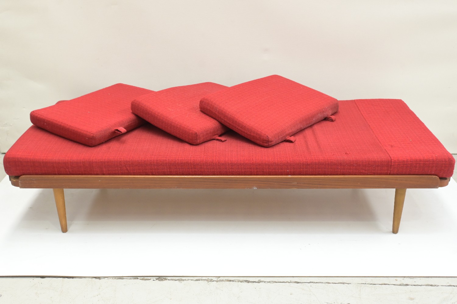 A DANISH MID-CENTURY TEAK DAYBED WITH RED CUSHIONS (A/F) (41H X 192W X 89D CM) (LEONARD JOEL DELIVERY: X-LARGE)