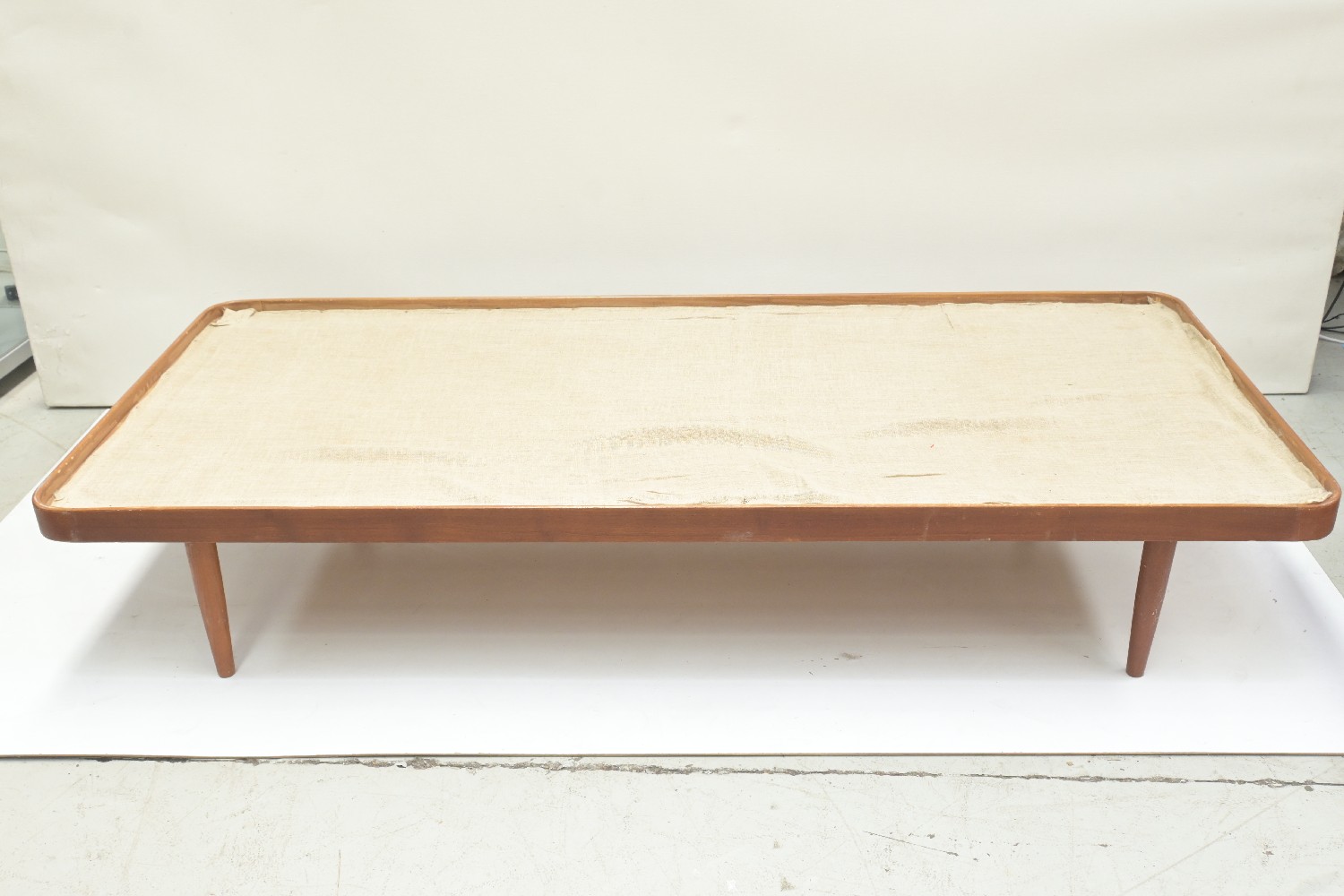 A DANISH MID-CENTURY TEAK DAYBED WITH FABRIC UNDERLAY (A/F) (34H X 193W X 88D CM) (LEONARD JOEL DELIVERY: X-LARGE)