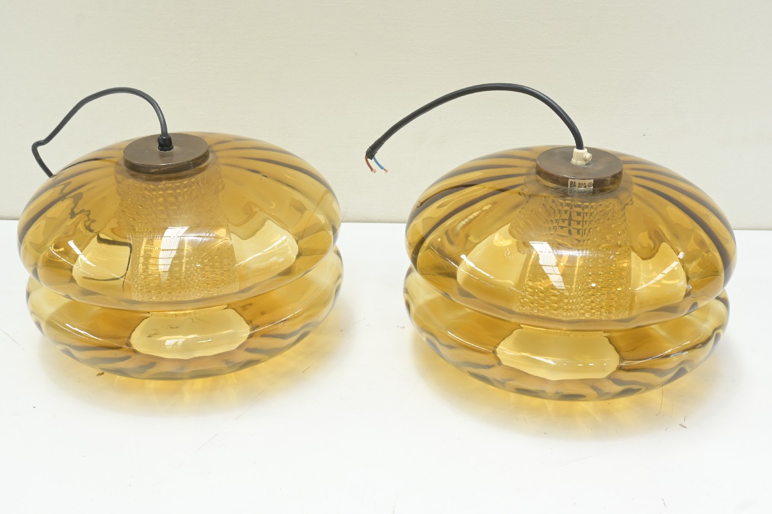 A PAIR OF DANISH MID CENTURY AMBER GLASS PENDANT LIGHTS (23H X 228DIA CM) (LEONARD JOEL DELIVERY SIZE: MEDIUM)