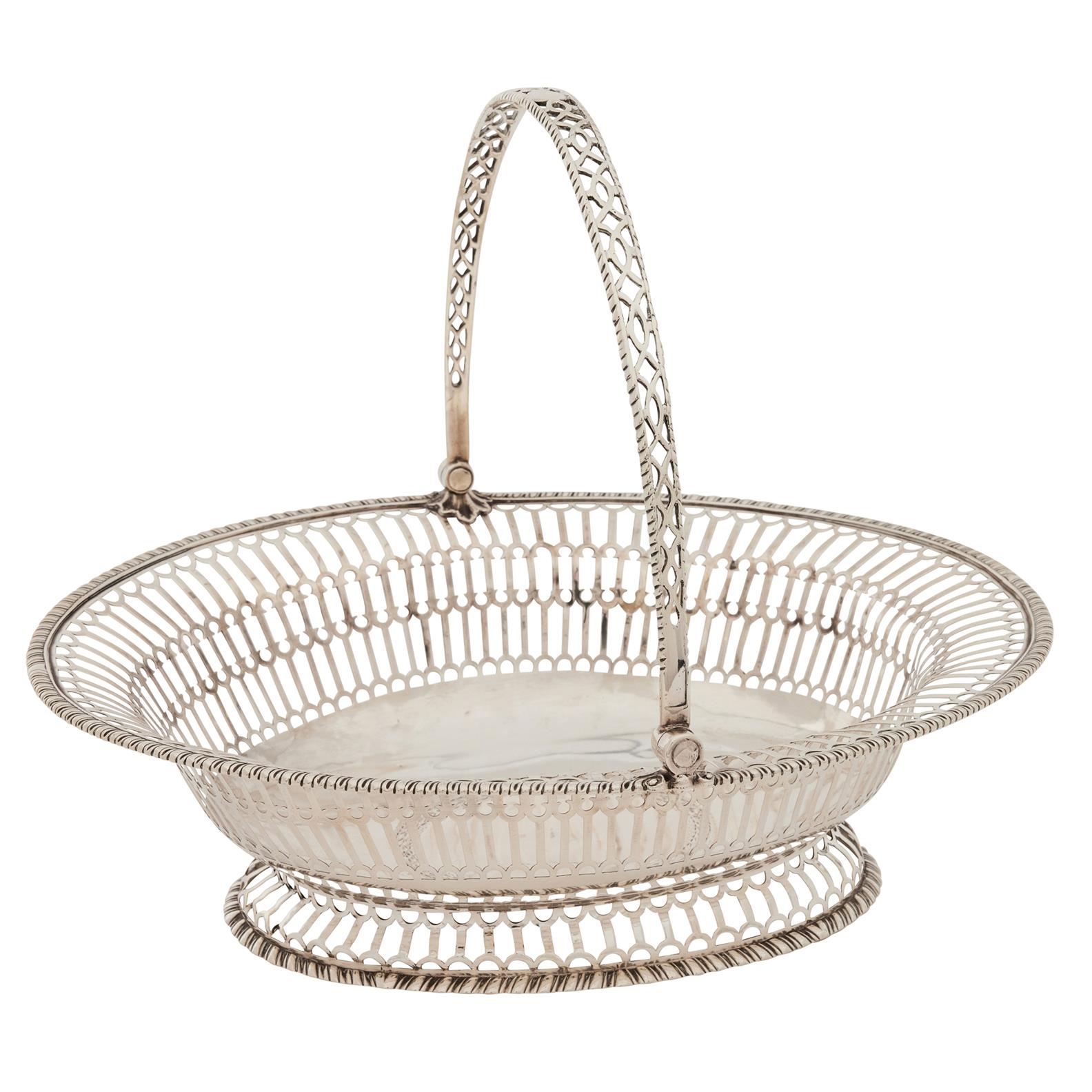 Maker's mark of William Plummer, London 1771, with gadrooned border and pierced sides, the swing handle with interlaced piercing on a gadrooned foot.