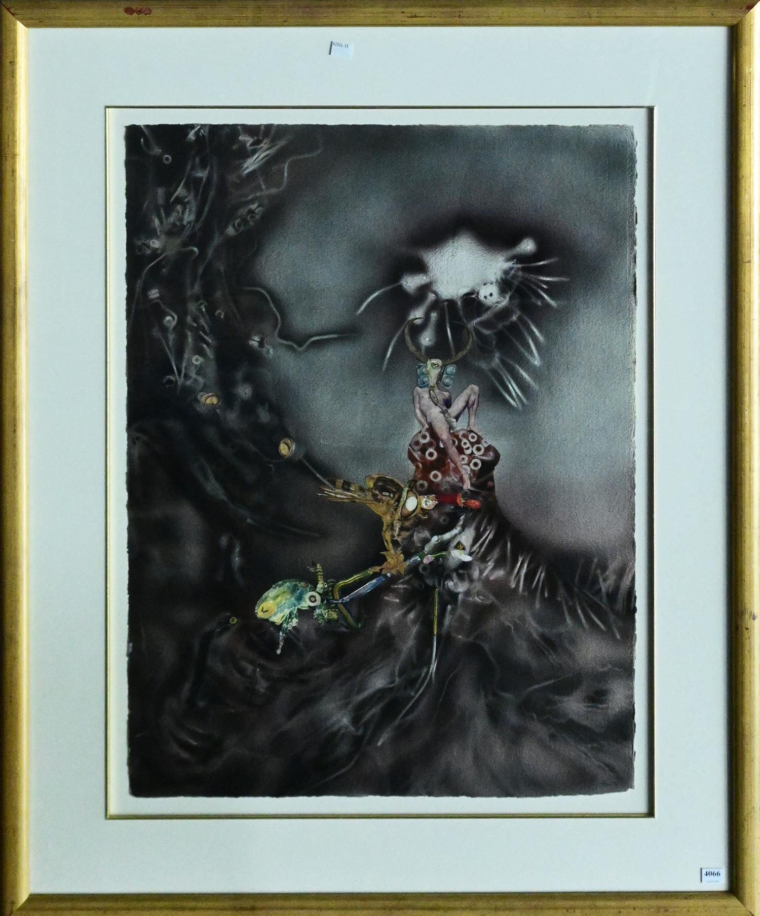 § JAMES GLEESON, SCISSOR MAN DISGUISED AS A HILLTOP ORACLE 1976, AIRBRUSH AND COLLAGE ON PAPER, SIGNED AND DATED LOWER RIGHT, 75 X 57CM, FRAME SIZE: 105 X 85CM