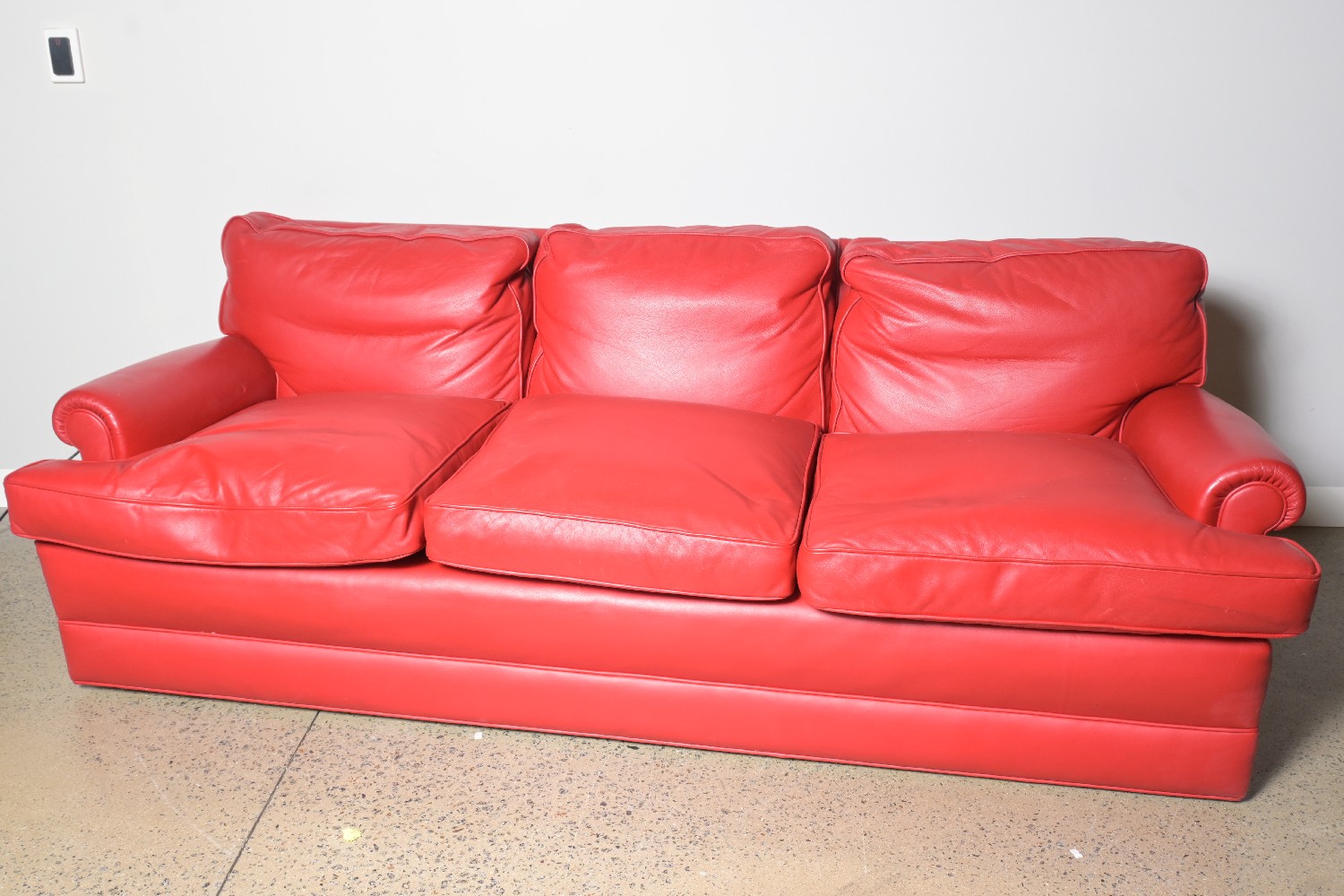 A RED LEATHER COUCH (78H x 200W x 90D CM) (PLEASE NOTE THIS HEAVY ITEM MUST BE REMOVED BY CARRIERS AT THE CUSTOMER'S EXPENSE. LEONARD JOEL STAFF CANNOT ASSIST CARRYING THIS ITEM) (X-LARGE)
