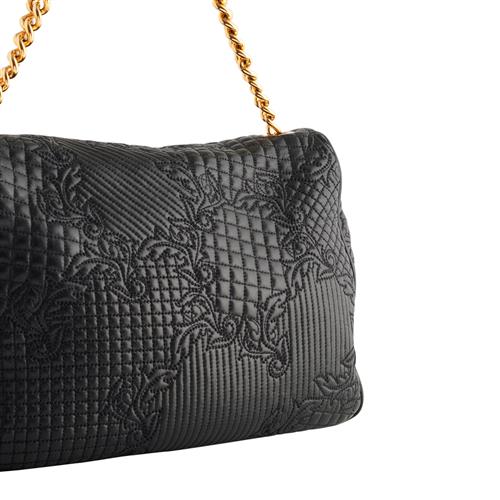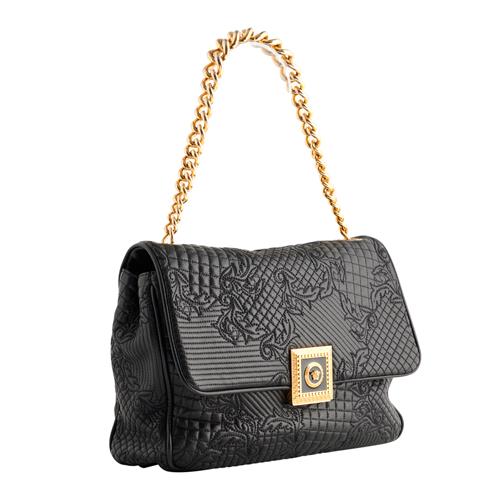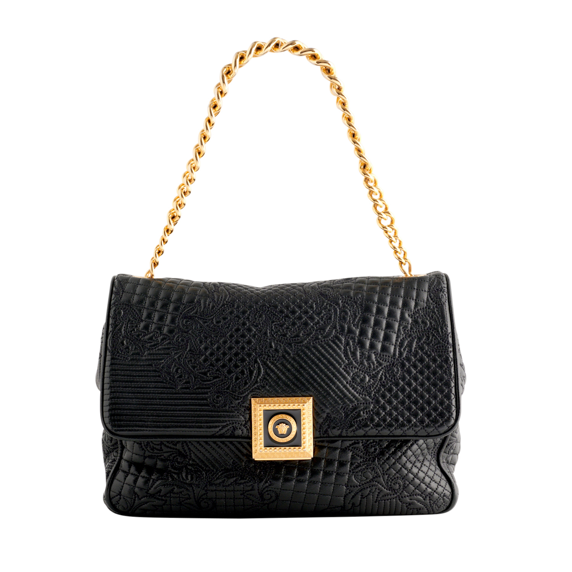 Styled in quilted black lambskin with gold tone hardware, featuring enamel set Medusa head closure, 23 x 31 x 8cm.