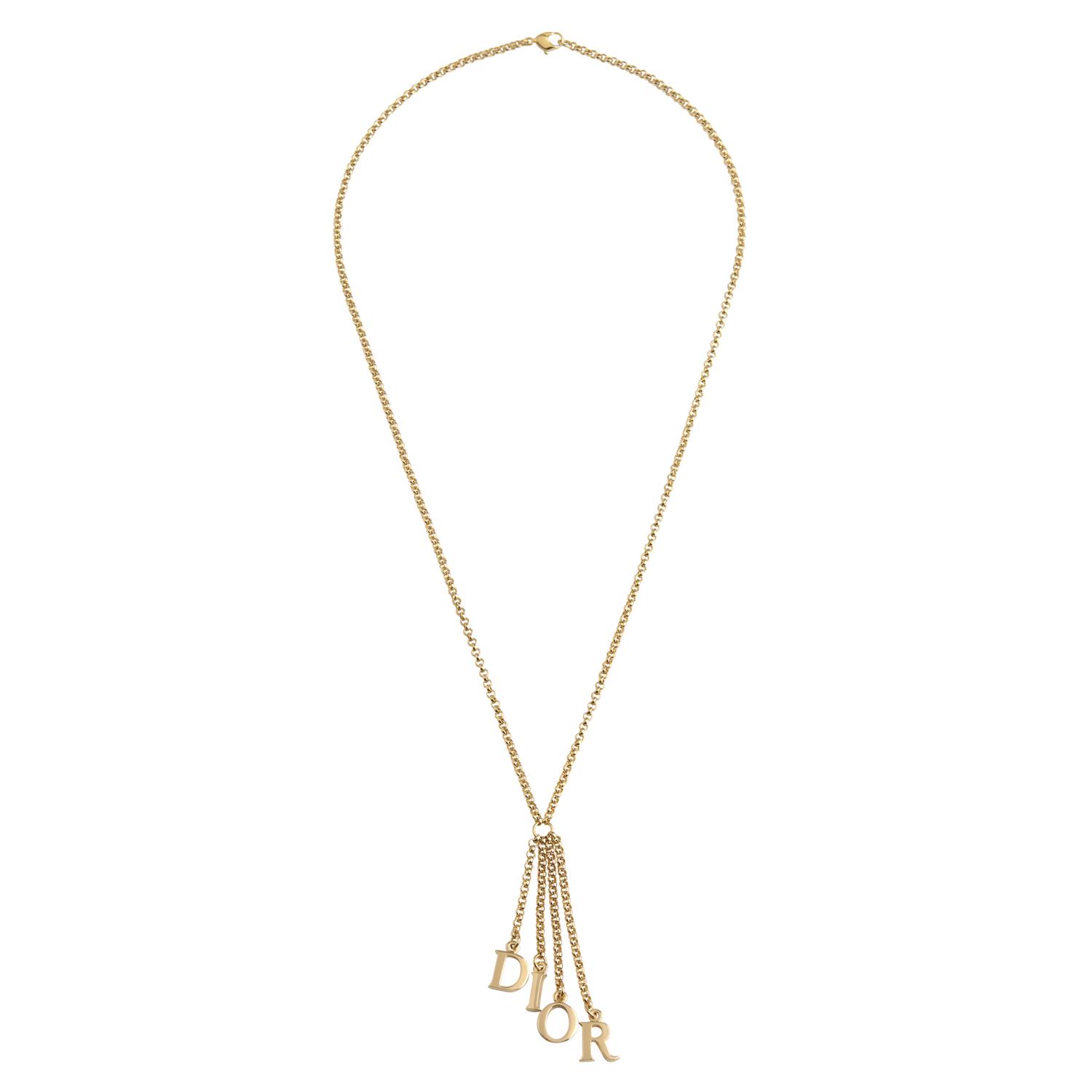 Styled in gold tone metal, suspending four charms from a fine belcher link chain, completed by a parrot clasp, 630mm.