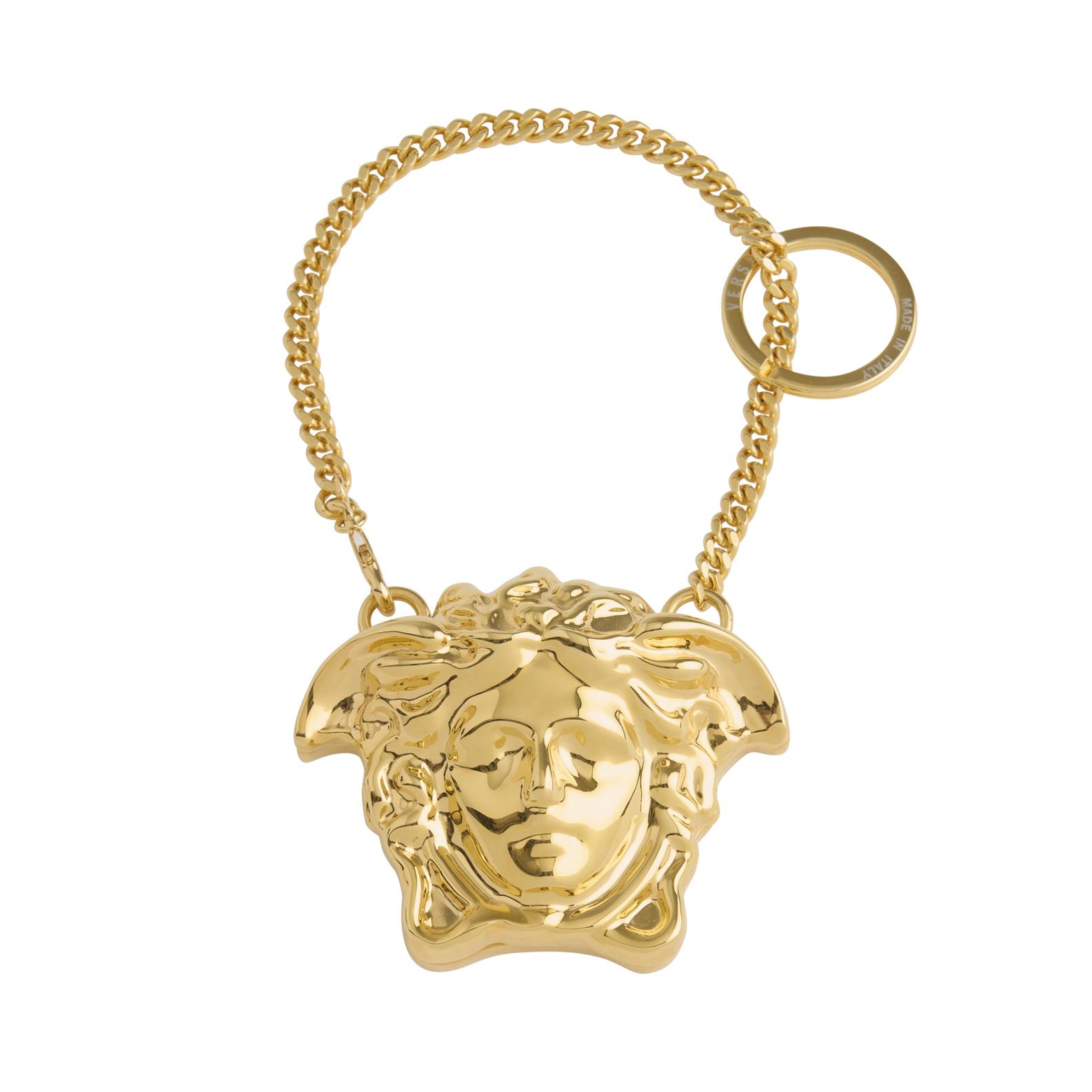 VERSACE, A KEY CHAIN STYLED IN GOLD TONE METAL, FEATURING OVERSIZED MEDUSA HEAD CHARM