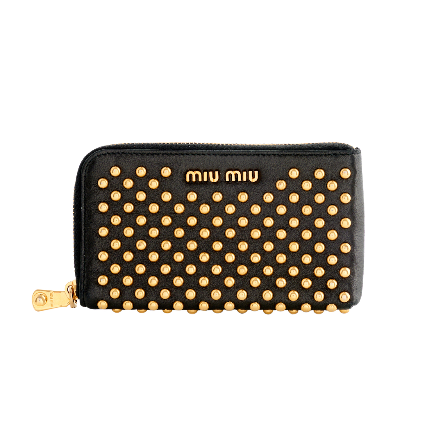 MIU MIU, A PURSE STYLED IN BLACK LEATHER WITH ROUNDED STUD DETAILING IN GOLD TONE METAL, 8.5 X 14.5 X 1CM, ACCOMPANIED BY A BOX
