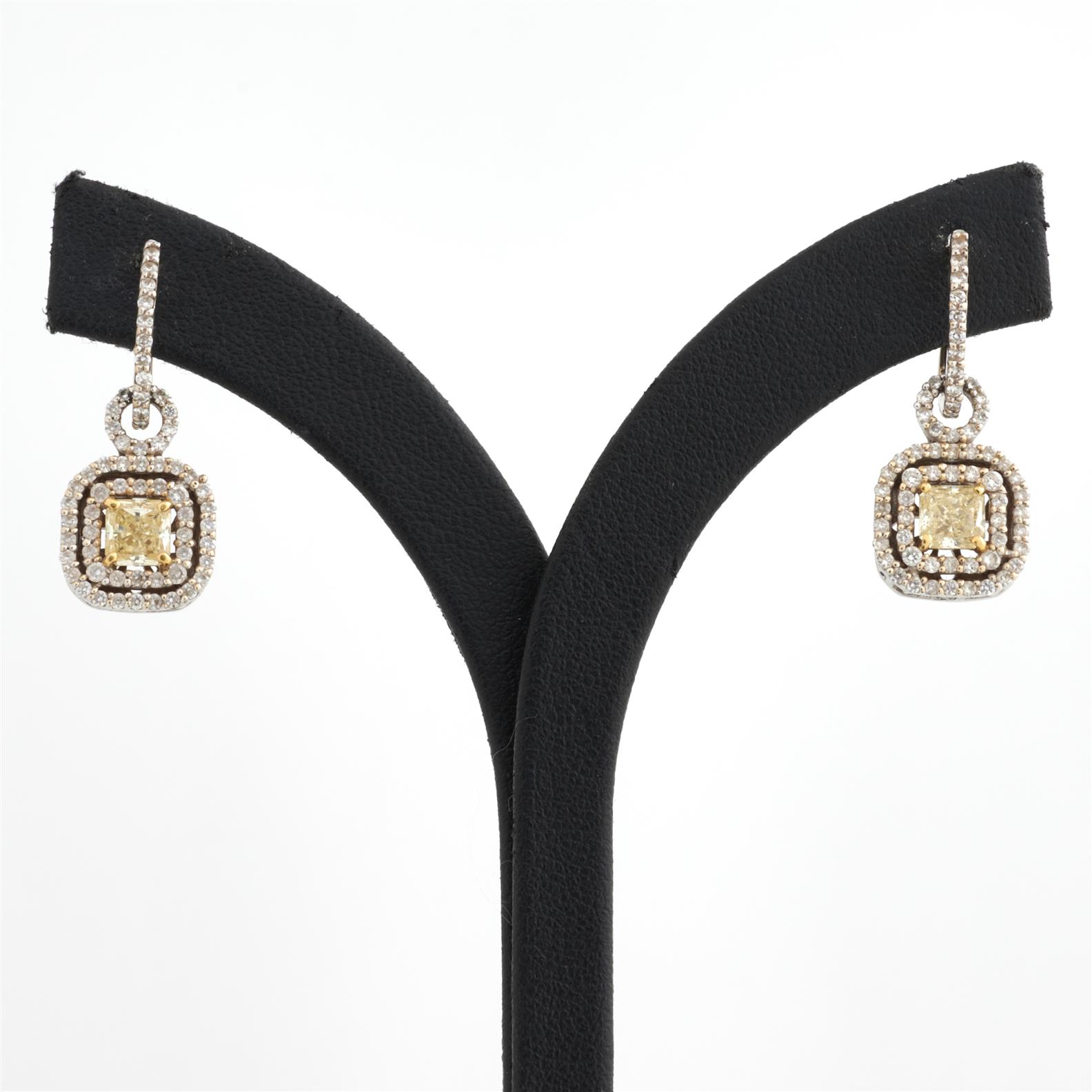 A PAIR OF YELLOW DIAMOND AND DIAMOND CLUSTER EARRINGS IN 18CT WHITE GOLD, TO EUROPEAN HOOK FITTINGS, 25MM