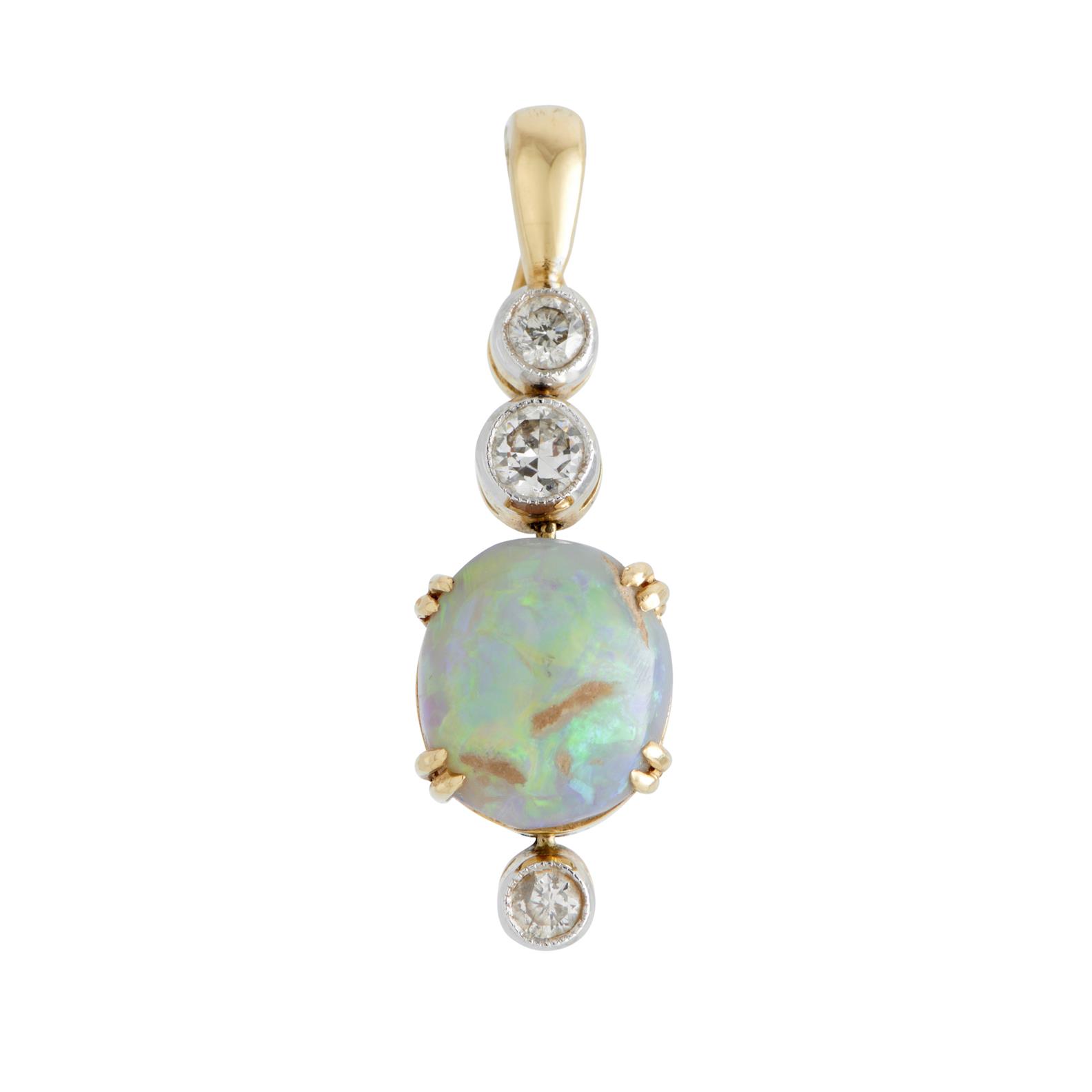 Claw-set with an oval opal cut en cabochon weighing approximately 6.50 carats, set below a pair of collet-set old European-cut diamonds and suspending a diamond drop, the diamonds together weighing approximately 0.60 carats, length 40mm, gross weight 7.3 grams.