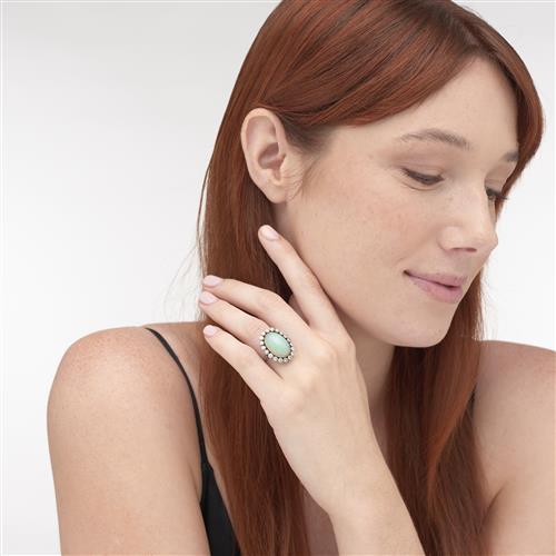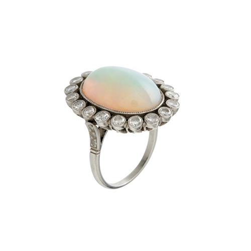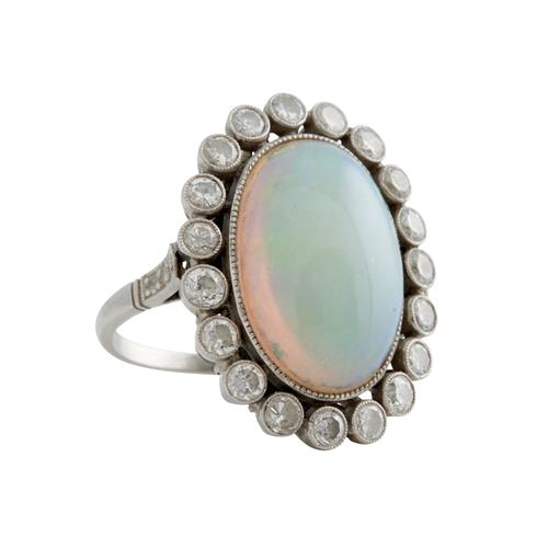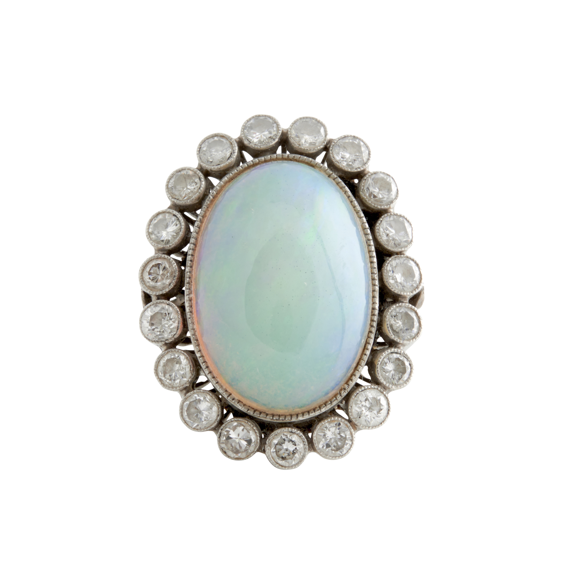 Of cluster design, centring a collet-set oval opal cut en cabochon weighing approximately 6.00 carats, within a surround of collet-set brilliant-cut diamonds together weighing approximately 0.60 carats, size M.