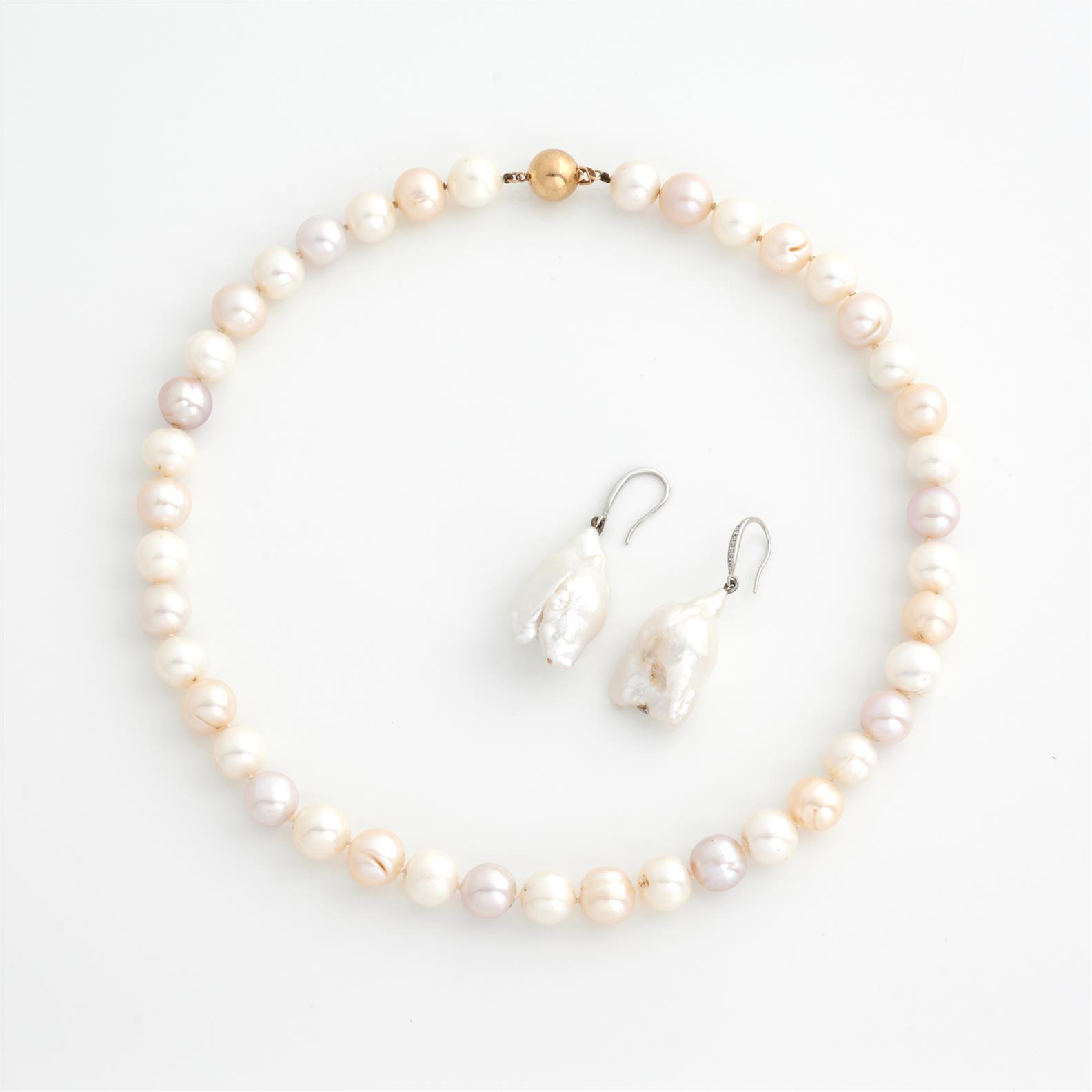 A STRAND OF FRESHWATER PEARLS TO A BALL CLASP IN 9CT GOLD, TOGETHER WITH A PAIR OF GEM SET FRESHWATER PEARL EARRINGS IN BASE METAL, TO SHEPHERD HOOK FITTINGS