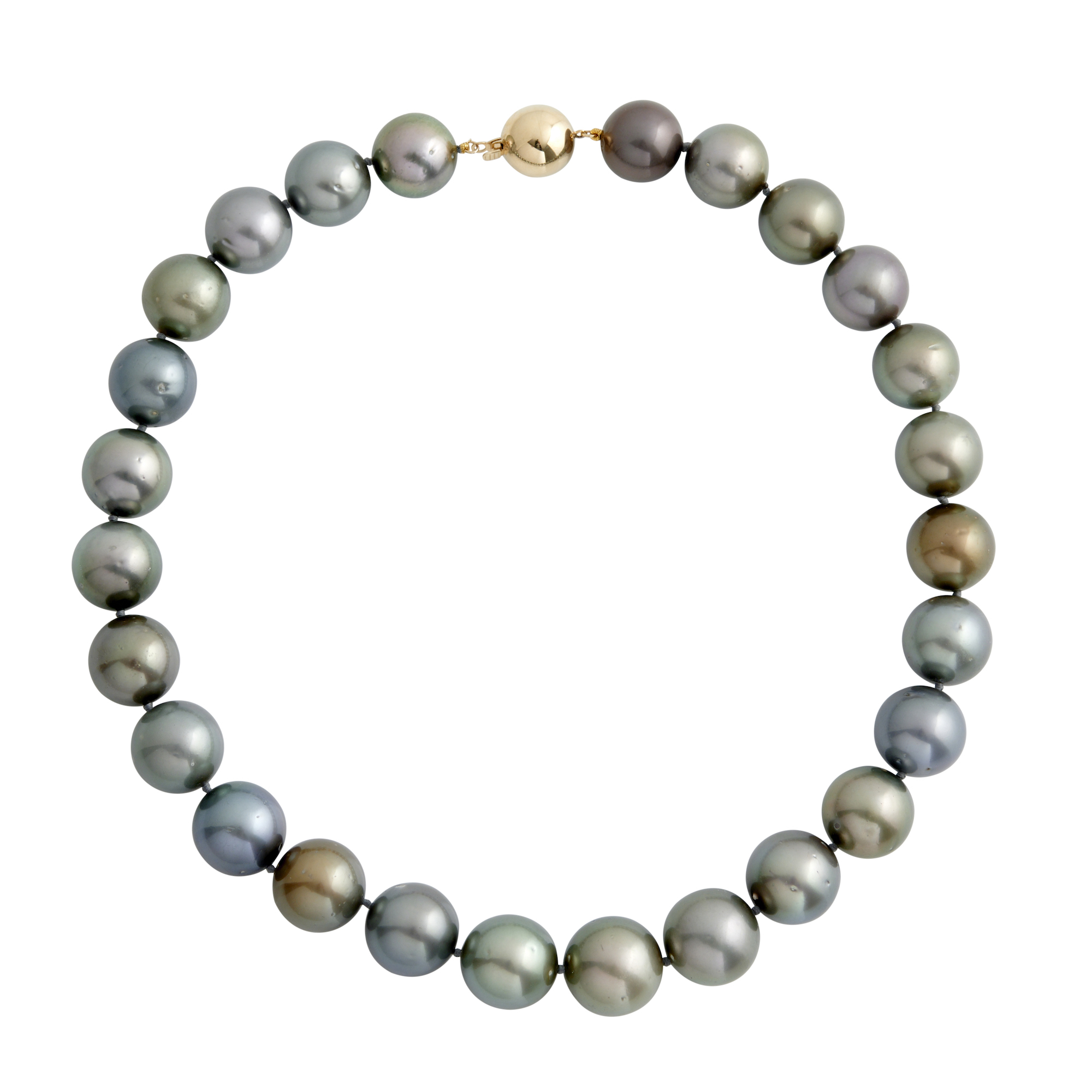 Comprising twenty-six graduating round pearls of mid-grey hues measuring approximately 14.7mm to 17.0mm, completed by a ball clasp in 9ct gold,