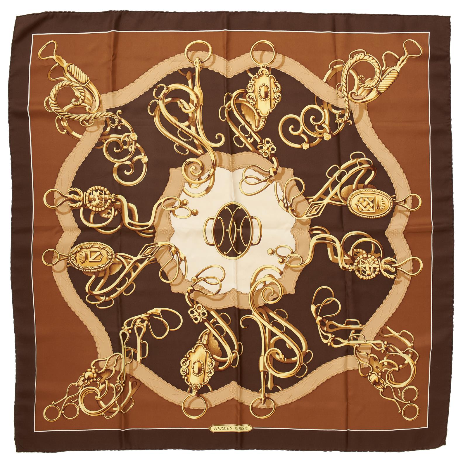 HERMÈS, A SILK CARRÉ STYLED IN BROWN AND TONAL HUES, 90CM SQUARE, BOXED