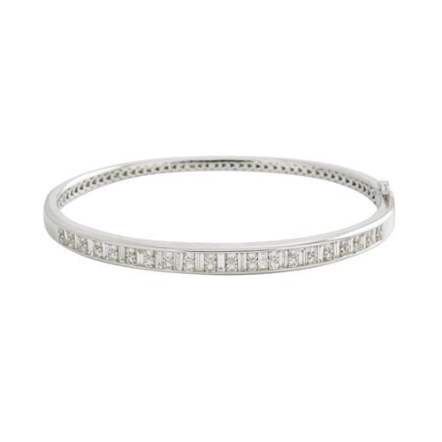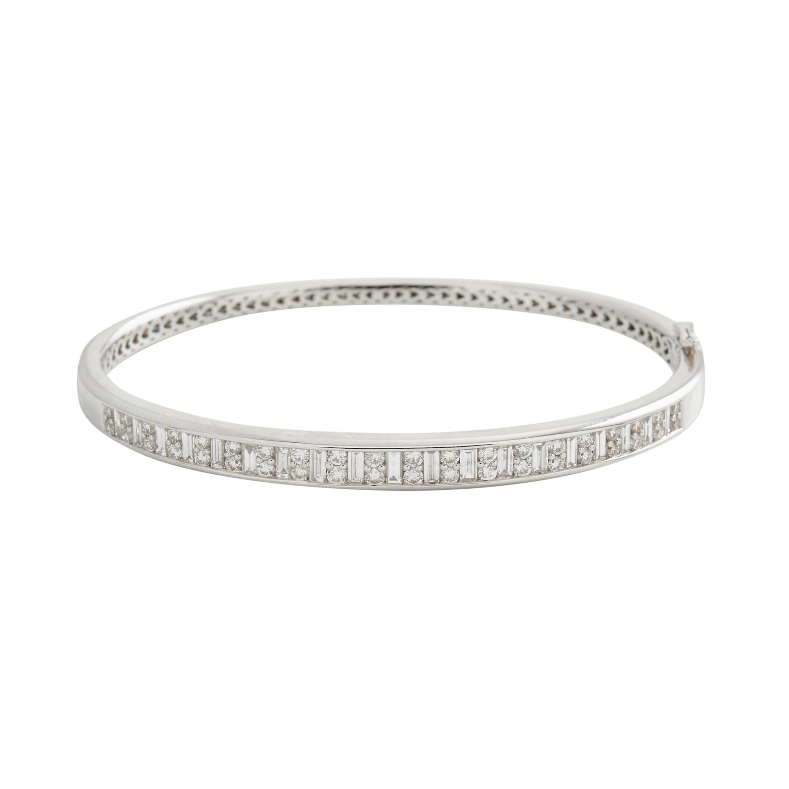 The oval hinged bangle, set to the top with alternating baguette-cut diamonds and pairs of brilliant-cut diamonds, the diamonds together weighing approximately 2.25 carats, signed Anton, inner circumference 170mm, gross weight 21.0 grams.