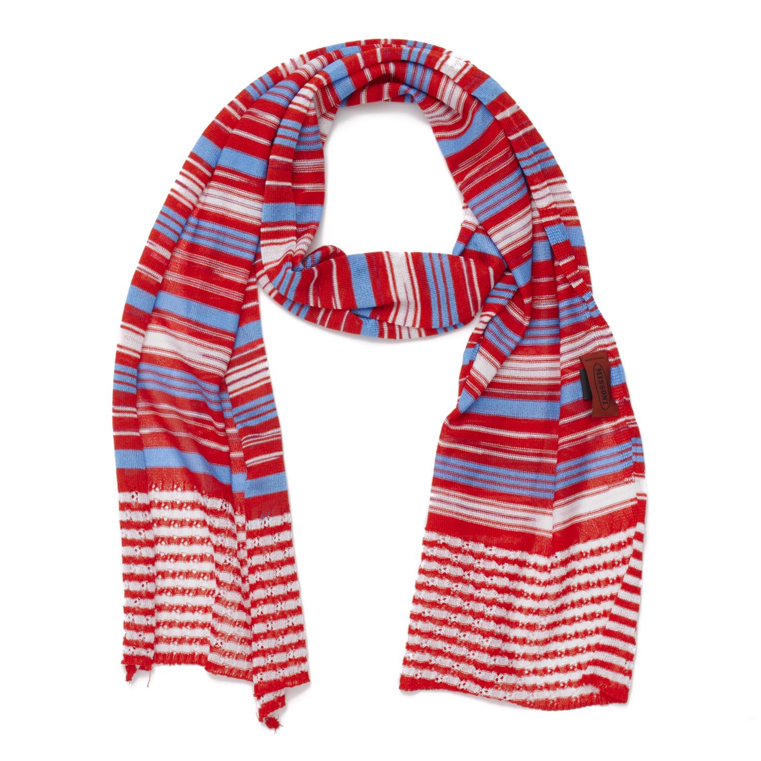 MISSONI, A SCARF STYLED IN RED, WHITE AND BLUE KNITTED VISCOSE, 130 X 38CM